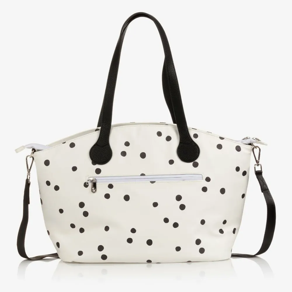 Stylish and practical ivory changing bag by Mayoral, made in soft faux leather. Patterned with black spots, it has a cute teddy bear appliqué on the front. The double zip fastening spacious main compartment has a silky lining and seven internal pockets. There is a comfortable detachable shoulder strap and stroller straps for ease when travelling. It comes with a matching lightweight and easy-to-clean changing mat.