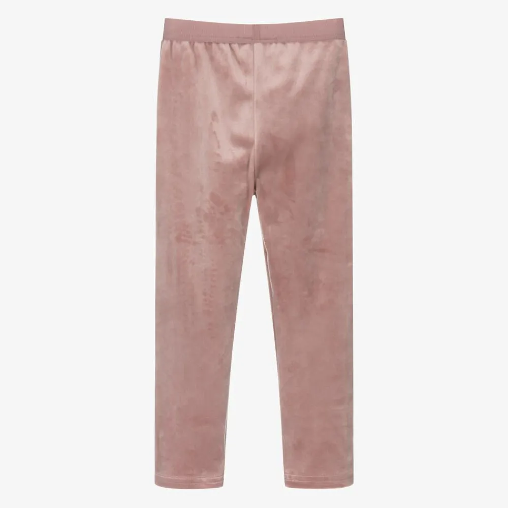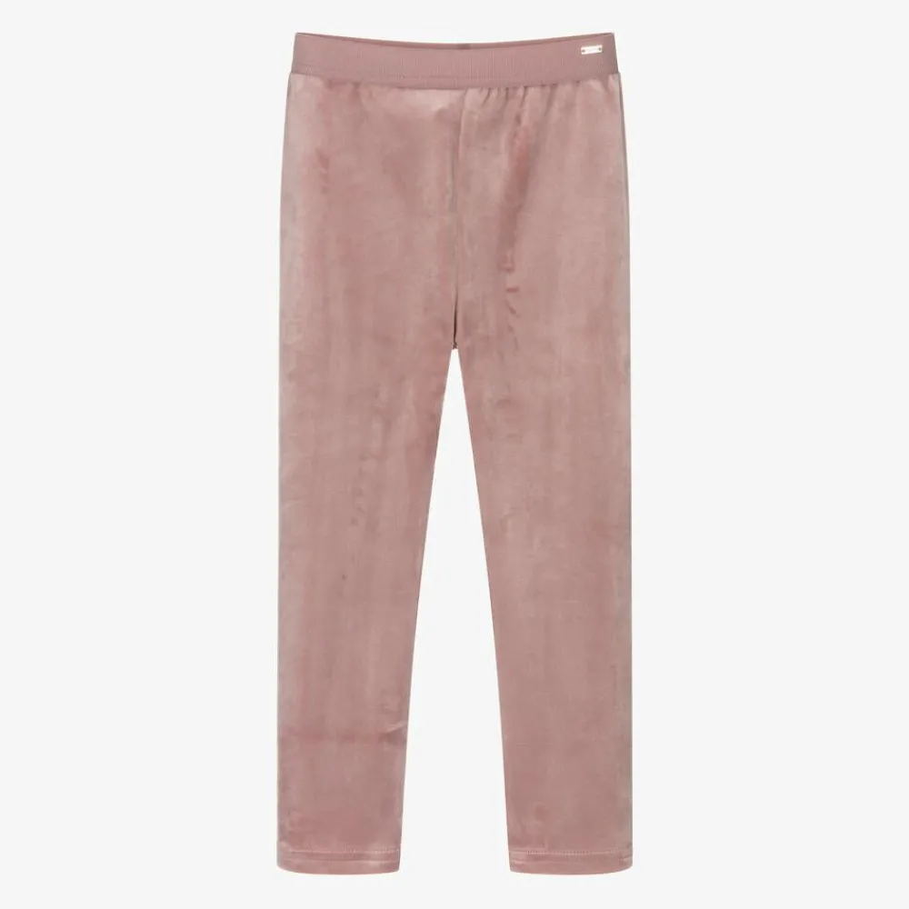 Dusky pink leggings for girls by Mayoral, made in beautifully soft and stretchy velour. Comfortable and easy to wear, they have a stretchy waistband trimmed with a gold logo tab for a discreet branded touch.
