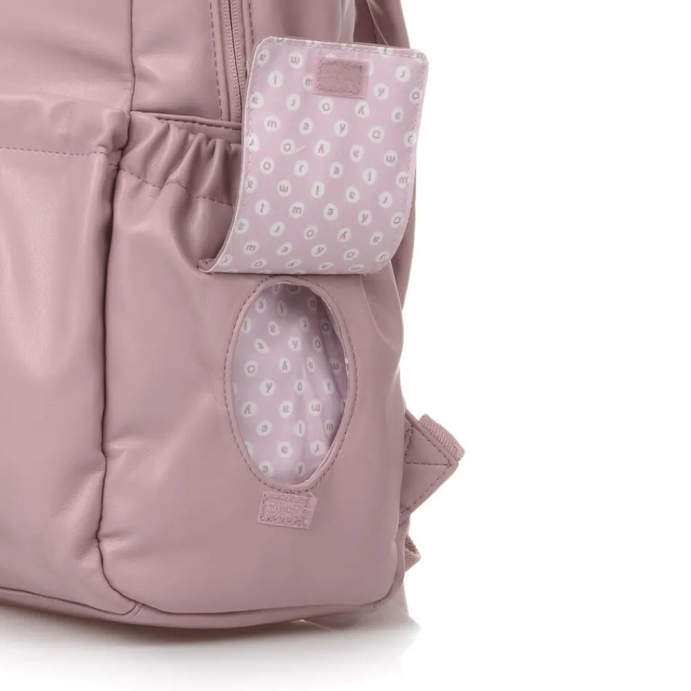 A dusky pink changing backpack by Mayoral, made in faux leather and lined in silky logo-patterned twill. Cleverly designed to store baby's essentials, it has a velcro-closing side pocket suitable for wipes or tissues, an inner foil-lined, insulated bottle holder, and multiple pockets. This practical bag has a two-way zip fastening and a front pocket with a drawcord detail. The bag includes a silky, padded changing mat. The branded carry handles and clip-on buggy straps are made in durable canvas, while the adjustable shoulder straps are padded for comfort.