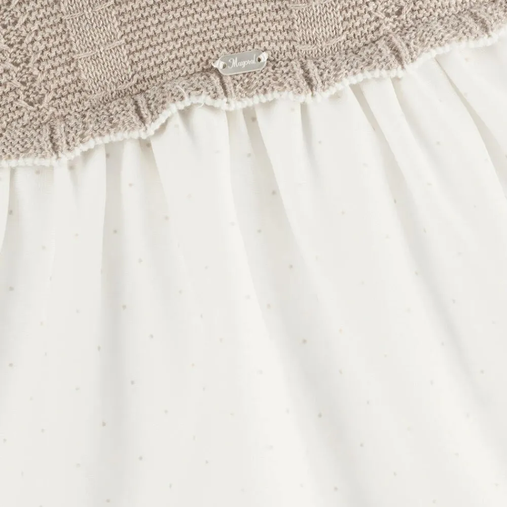 A charming beige and ivory dress for baby girls by Mayoral. The long-sleeved bodice is made from a soft knit with scalloped edging on the sweet collar and cuffs. Patterned with a delicate beige dot design, the smooth organza gathered skirt has a lightweight cotton lining for added comfort. Fastening neatly with pearlescent buttons on the back, it has a logo-engraved charm stitched on the waistline.
