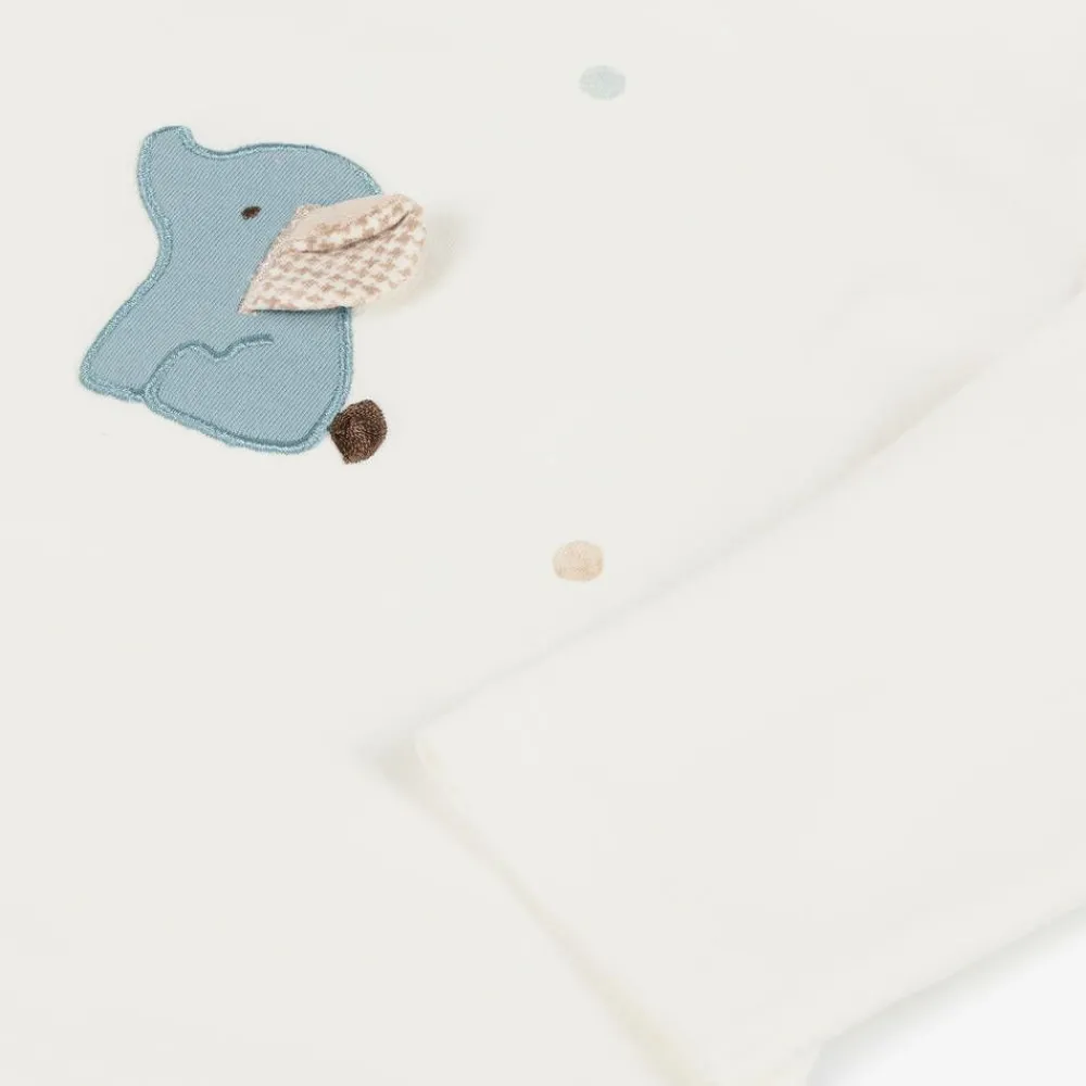 Casual and comfortable for baby boys, this cute tracksuit set is by Mayoral. In blue, ivory and beige stripes, the zip-up top has sweet faux pockets on the front and a protective chin guard over the zip puller. The blue joggers have cuffed ankles and a comfortable elasticated waist. Completing the set is an ivory long-sleeved top, with a sweet elephant appliqué on the front, and easy-fastening poppers on one shoulder.