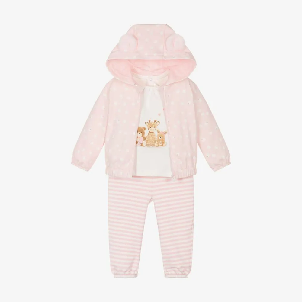 Adorable pink tracksuit set for baby girls by Mayoral, made from soft and stretchy cotton jersey. Lovely for comfortable casual wear, the zip-up top has a spotty white pattern and cute faux fur 3D ears on the hood. Warm and fleecy on the inside, the striped joggers have a gently elasticated waistband and stretchy cuffs. A white long-sleeved top completes the sweet outfit, it has a delightful baby animal print on the front and fastens with poppers on the back.