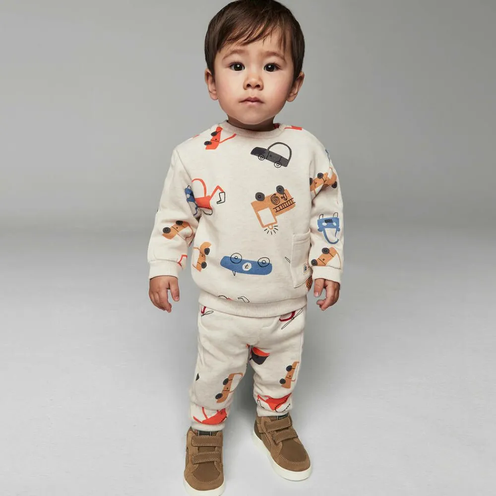 Fun for little boys, this beige sweatshirt by Mayoral is patterned with colourful vehicles. It is made in mid-weight cotton blend jersey with a soft fleecy interior and cosy ribbed trims. There is a cute and colourful logo tab on the patch pocket and popper fastenings on one shoulder to help with dressing.