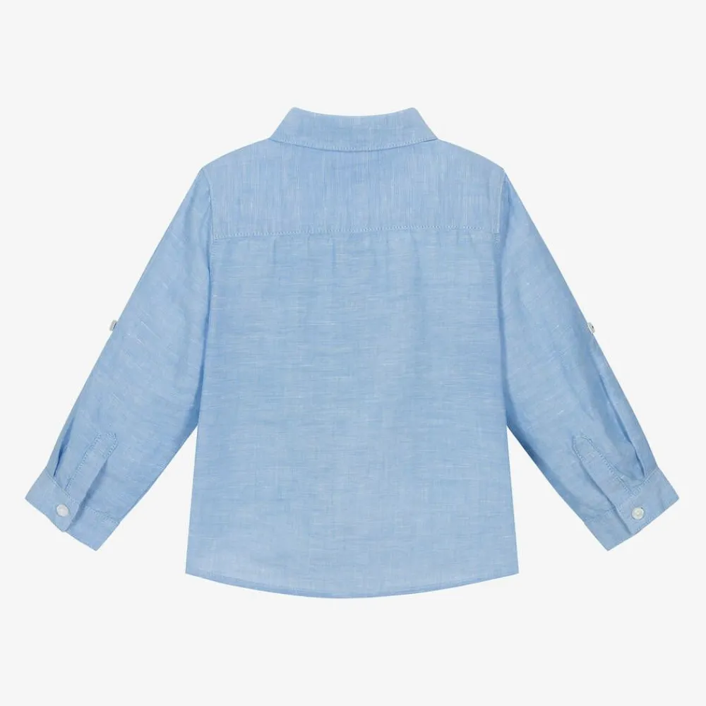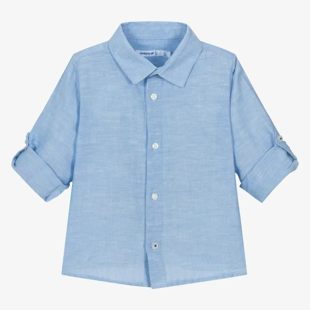 Smart light blue shirt for little boys by Mayoral, woven in a comfortable cotton and linen blend. It has a pointed collar and front button fastenings. The long sleeves have a useful button tab, allowing them to be turned up and fixed in place.