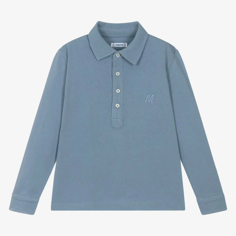 Blue long-sleeved polo shirt for boys by Mayoral, made in soft cotton piqué. This everyday style has button fastenings on the front and cuffs, with a tonal 'M' embroidered on the chest for a discreet, branded sign off.