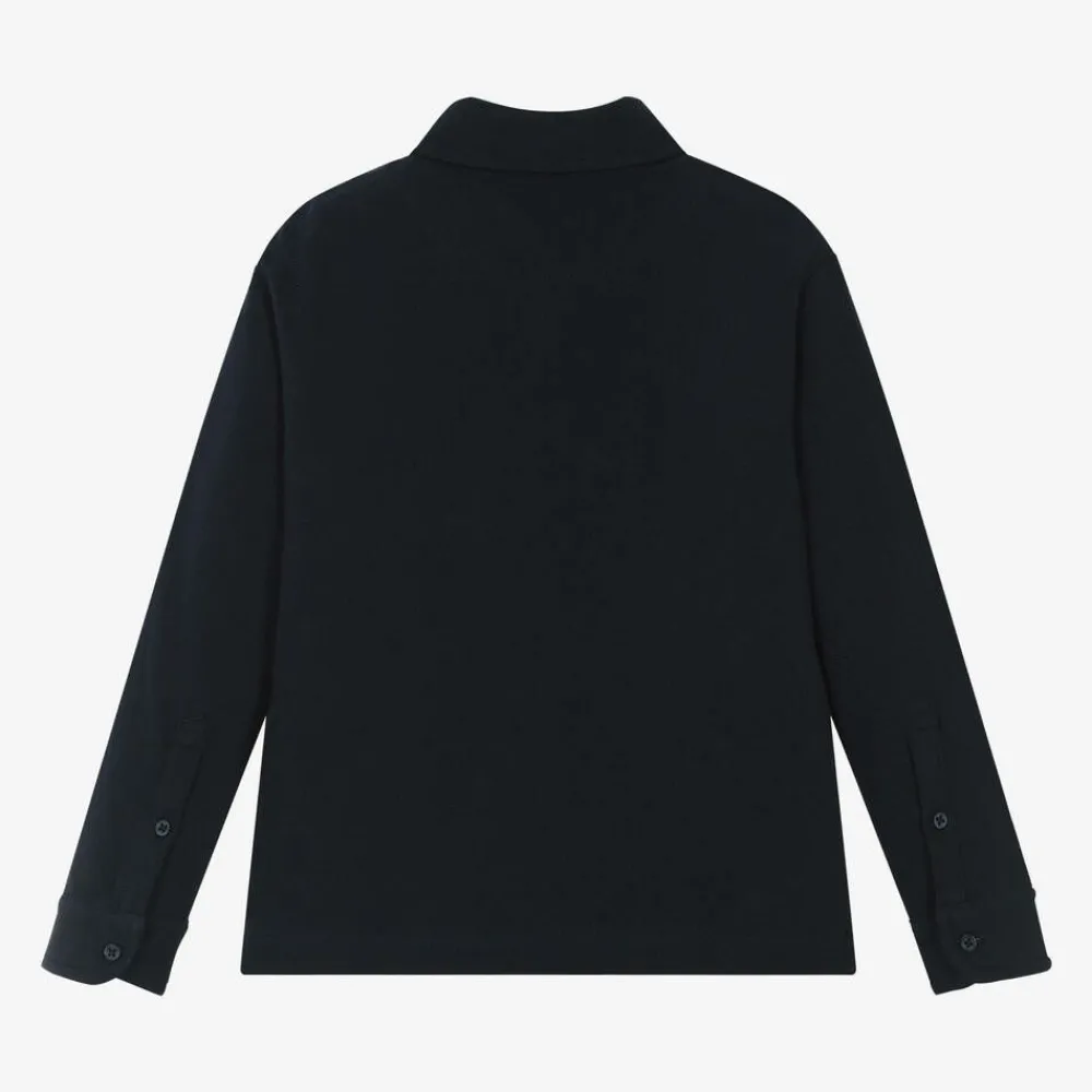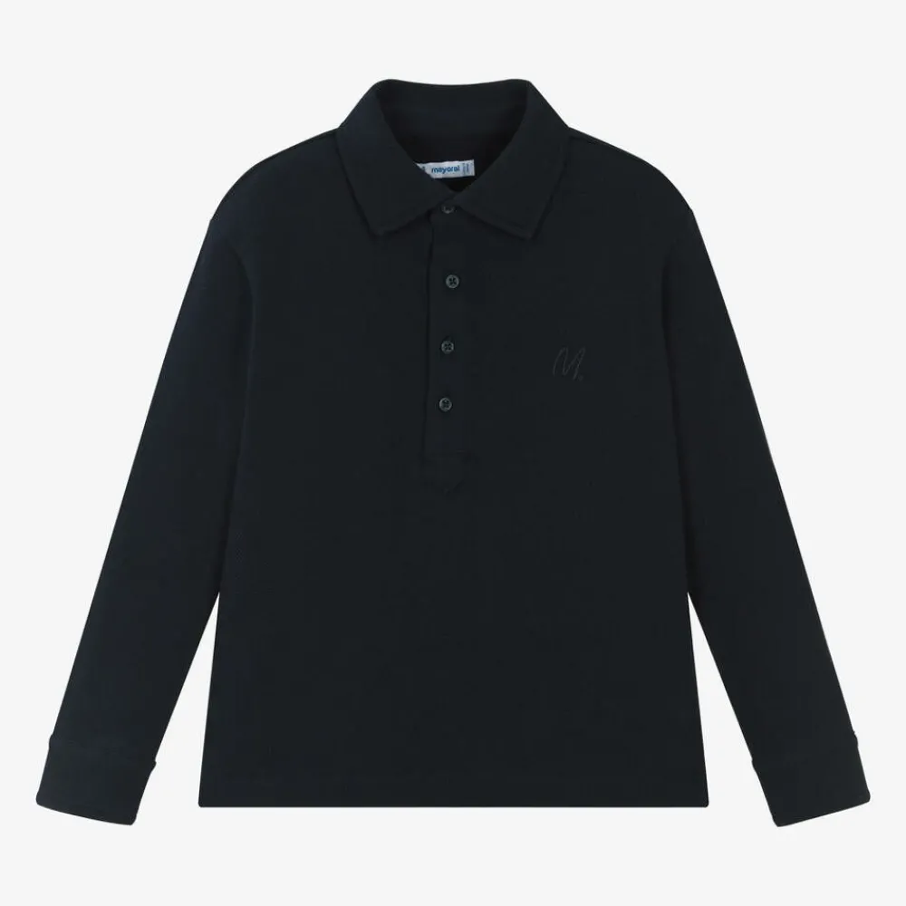 Navy blue long-sleeved polo shirt for boys by Mayoral, made in soft cotton piqué. This everyday style has button fastenings on the front and cuffs, with a tonal 'M' embroidered on the chest for a discreet, branded sign off.