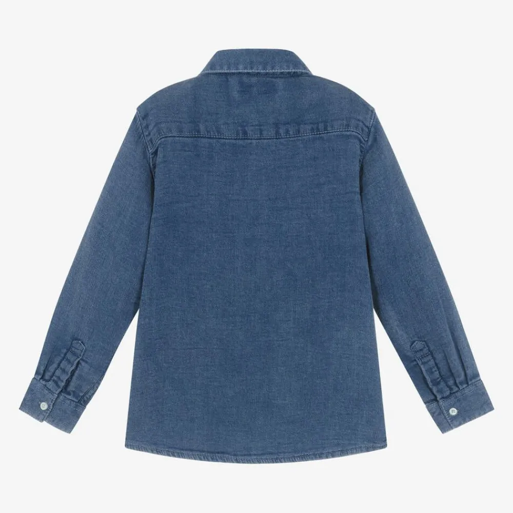 A mid-blue wash denim shirt for boys by Mayoral. Comfortable and lightweight, it is made in soft and breathable cotton. This classic casual look has long sleeves, a pointed collar and button fastenings on the front and cuffs. There is a beige logo tab stitched by the hem.
