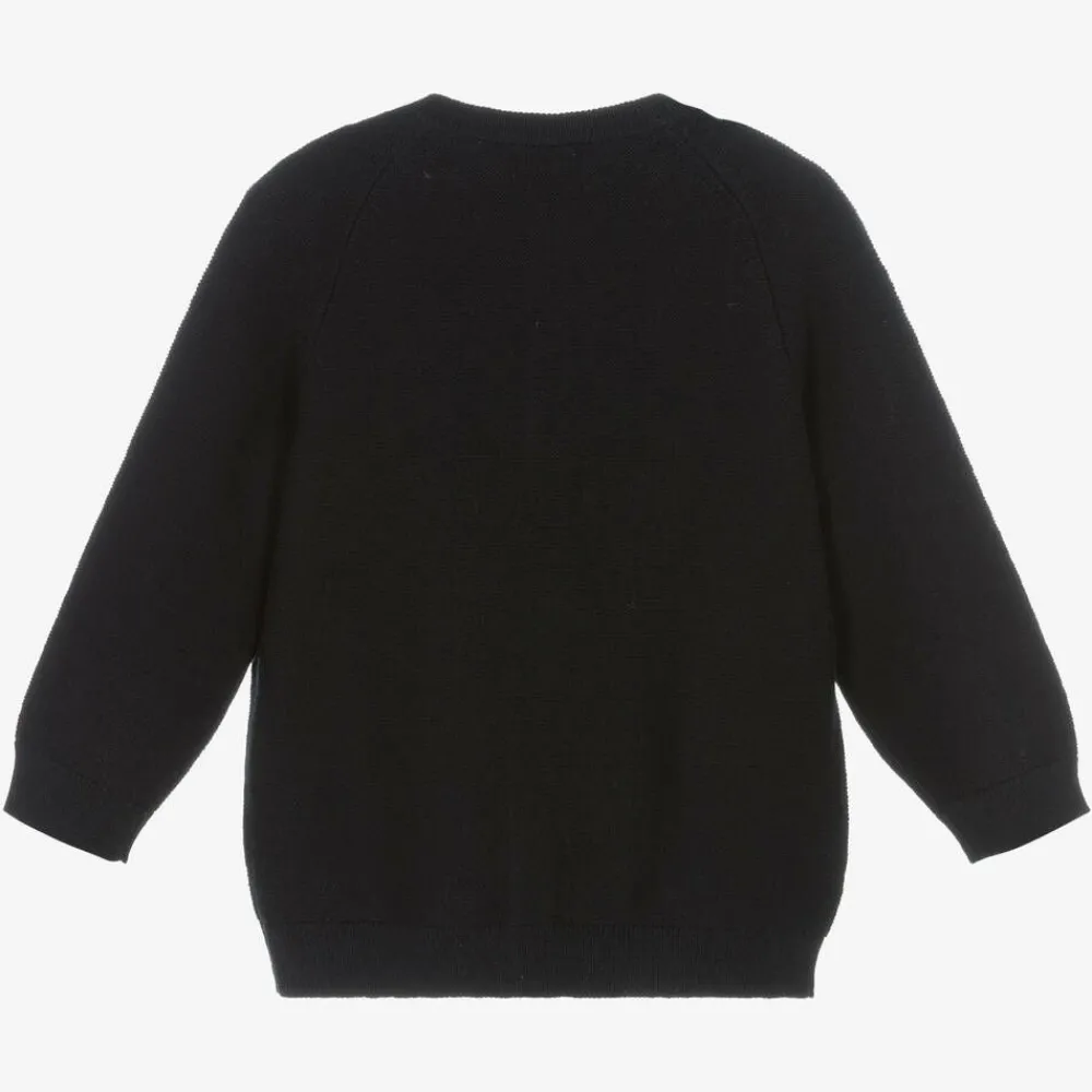 Cosy navy blue cardigan for little boys by Mayoral, knitted in a soft cotton and wool blend. It has a round neckline and fastens with buttons down the front. There is subtle faux pocket detailing, trimmed with matching buttons.