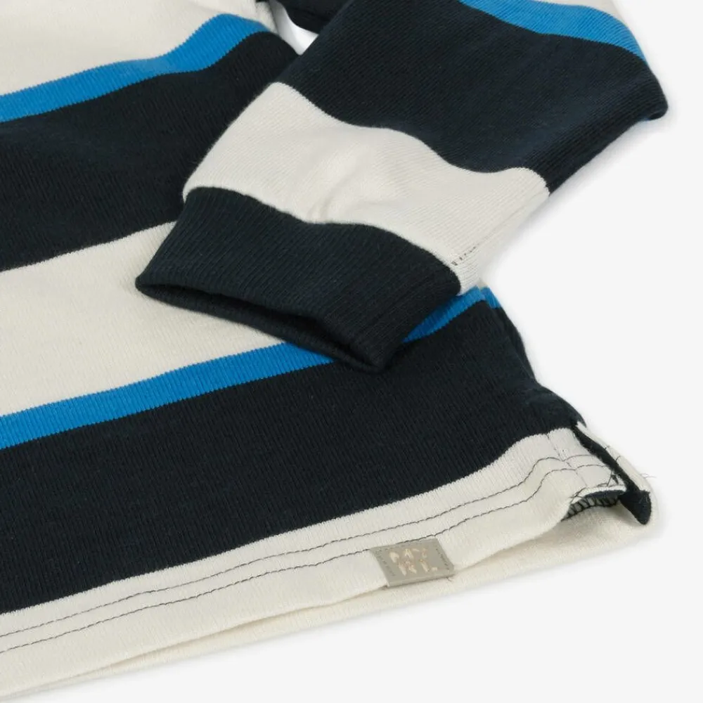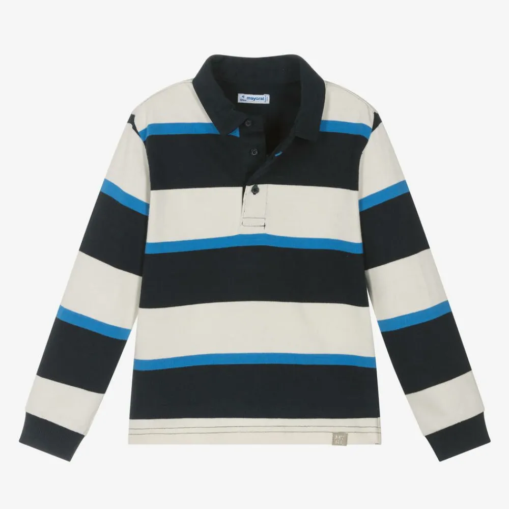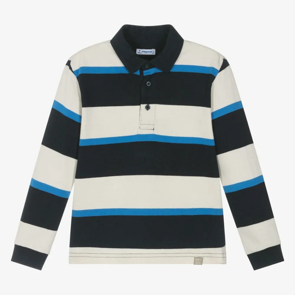 Blue rugby shirt for boys by Mayoral, with navy blue and ivory stripes. Long-sleeved, it is made in soft cotton jersey and has a woven collar. This casual top has a short button placket on the front, stretchy ribbed cuffs, and side vents for ease of movement.
