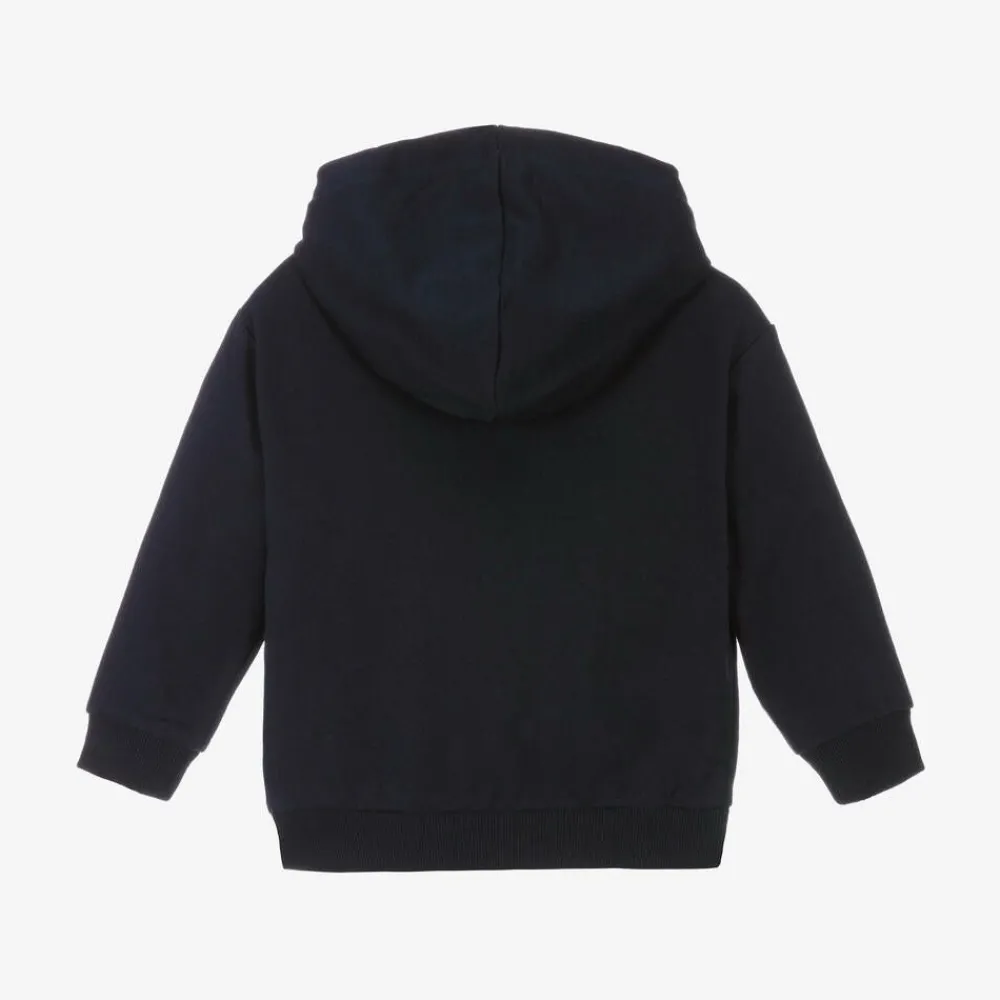 Casual zip-up top for little boys by Mayoral, in navy blue. Made in soft cotton-blend jersey, it has a fixed hood lined in contrasting beige marl, with ribbed trims for added cosiness. The words 'Jam in the city' are printed in beige and blue on the front, with a fun car print on the pouch pockets.