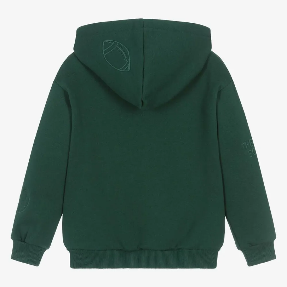 A dark green hoodie for boys by Mayoral, with a sports-themed embroidered design. Casual and comfortable, it is made in soft mid-weight cotton-blend jersey, with a cosy fleecy inside and ribbed trims.