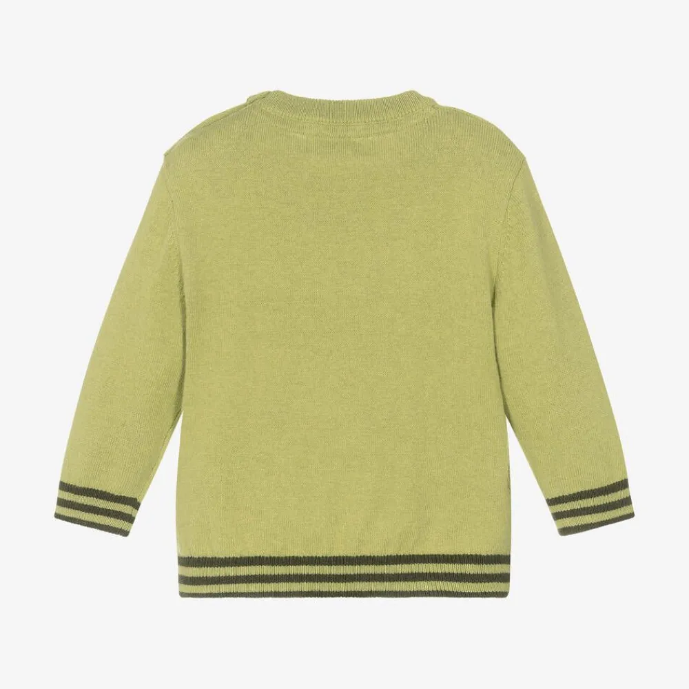 A lovely green sweater for little boys by Mayoral, knitted in a soft blend of cotton and wool. It has a cute polar bear motif on the front, wearing a cosy hat and jumper in grey and white. This sweet top has a crew neckline, striped ribbed trims, and button fastenings on one shoulder to help with dressing.