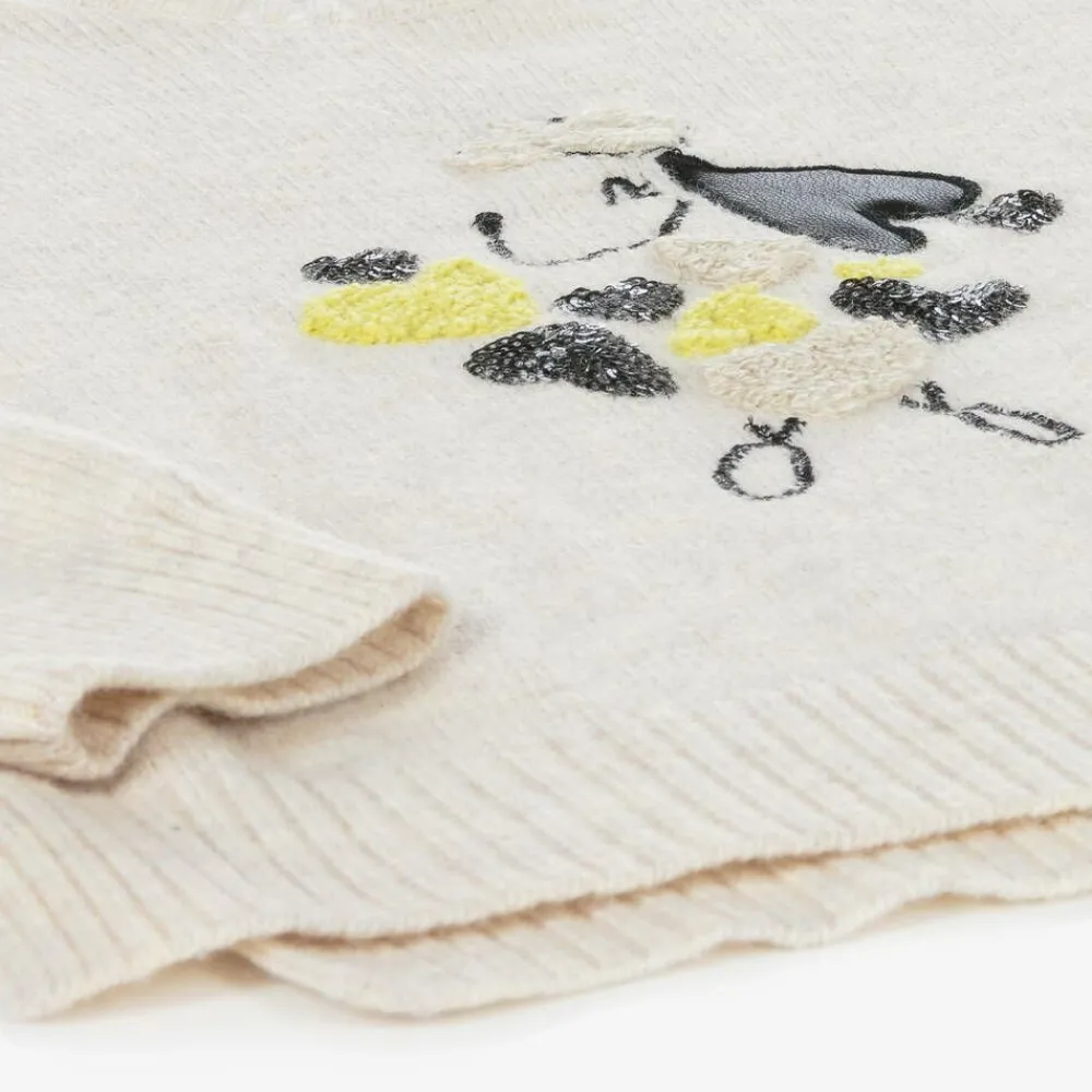 Super cute beige marl sweater for girls by Spanish brand Mayoral, made in a soft knit with a touch of warm wool. On the front is an embroidered dog that has faux leather appliqué ears, with bouclé and shimmering, black, sequinned hearts. The sweater has long sleeves and cosy, ribbed trims.
