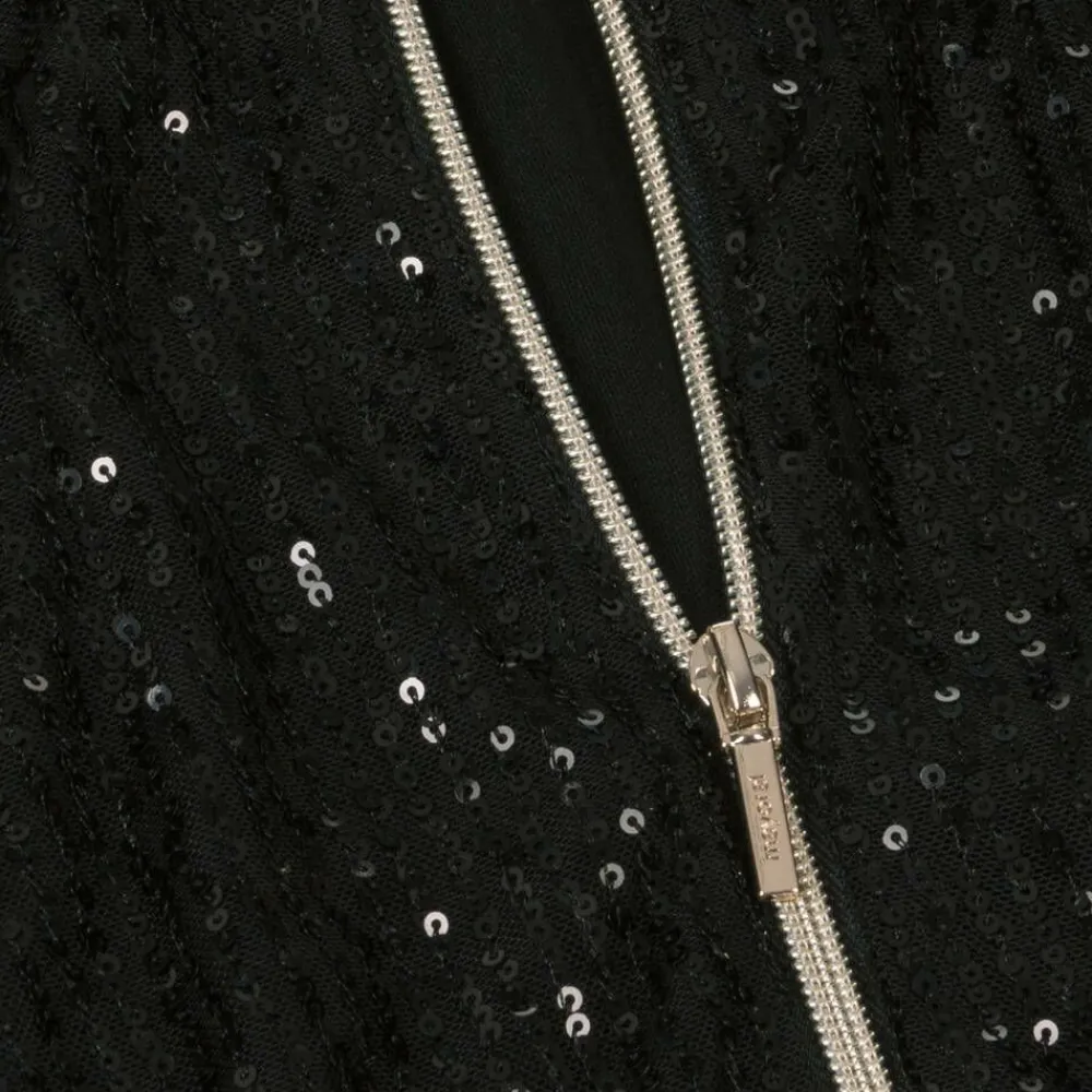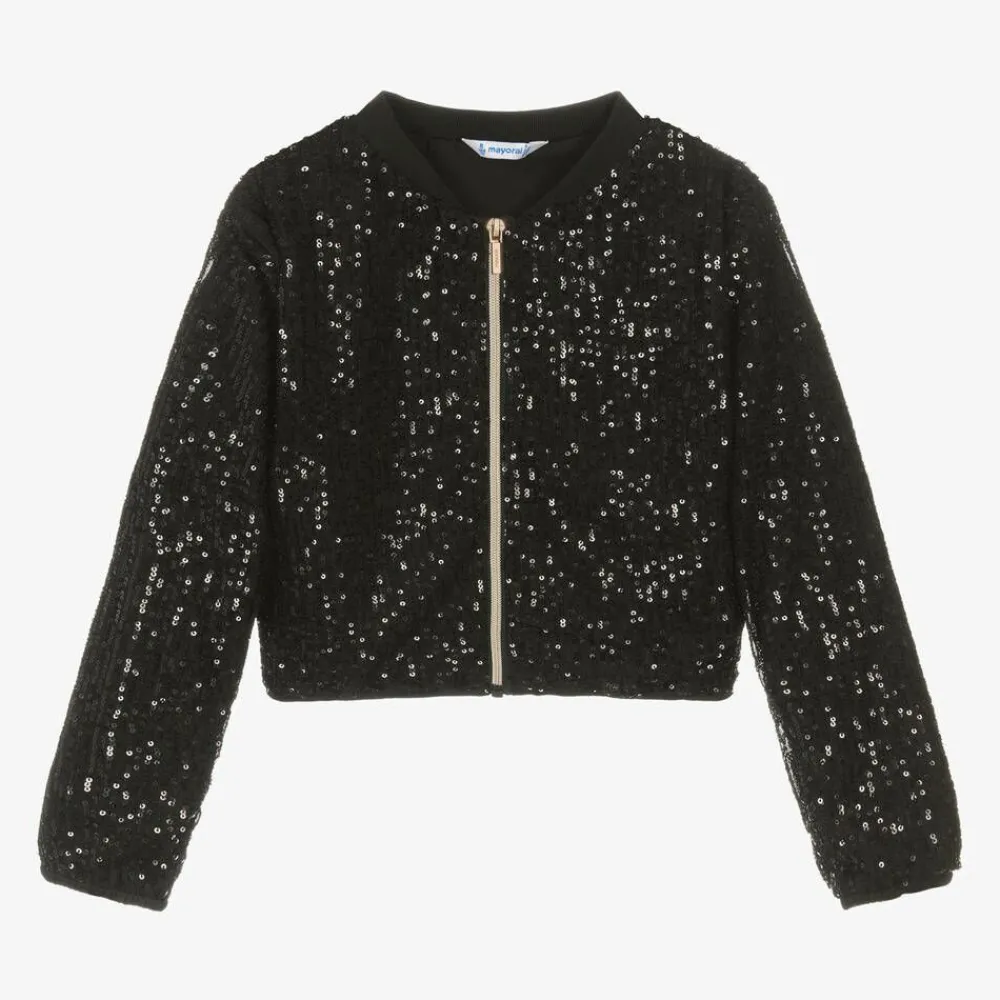 Black zip-up top for older girls by Mayoral, stitched with shiny sequins to elevate this casual bomber style. The sequins are sewn onto fine, lightweight tulle and the top is comfortably lined in soft jersey. Fastening with a gold-tone zip and branded pull, it has a ribbed collar and jersey trim on the elasticated cuffs and hem.