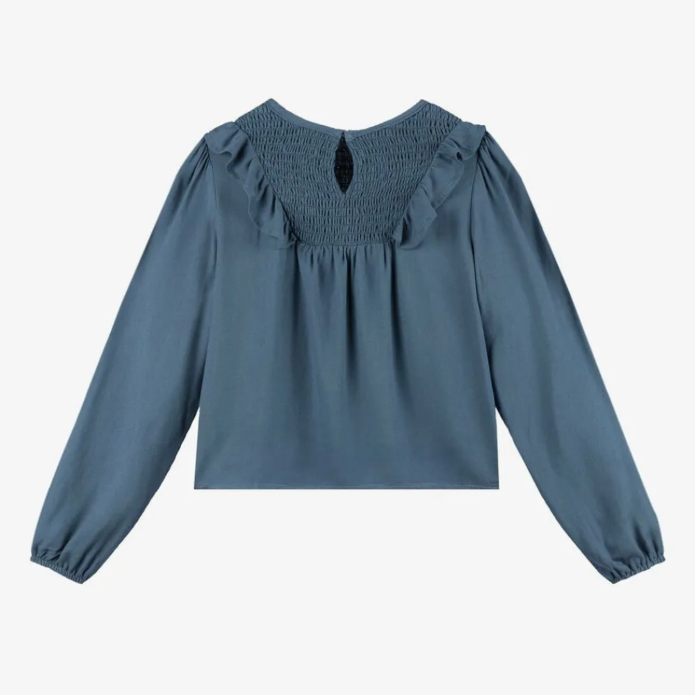 Pretty blue blouse for older girls by Mayoral, made in soft viscose twill. There is a frill on the front and over the shoulders, with shirred panels front and back. The long sleeves have elasticated cuffs and there is a single keyhole button fastening on the back.