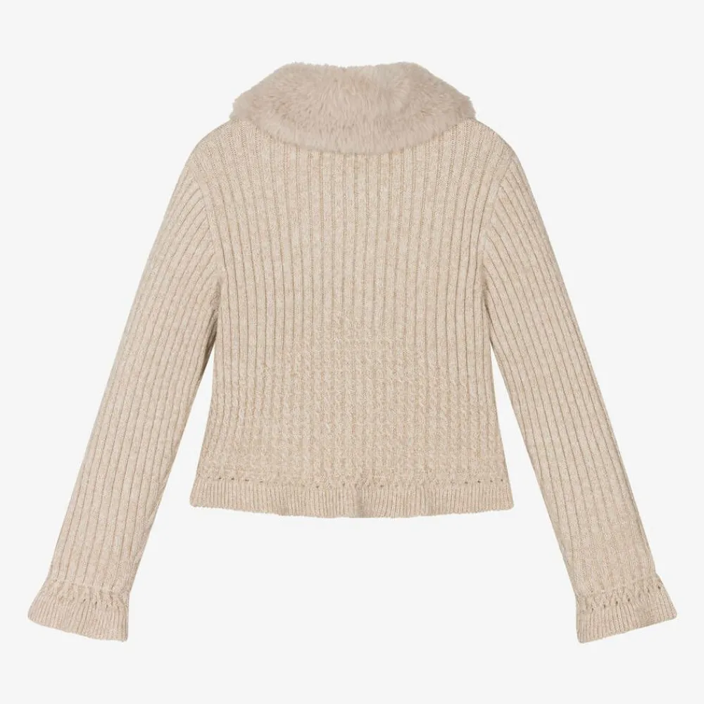Champagne gold ribbed cardigan for girls by Mayoral, with cable-knit details. Made in a soft blend with viscose, this glittering cardigan has a removable, button-on collar in faux fur. It has silver-hued buttons to fasten on the front. This item contains recycled fibres.