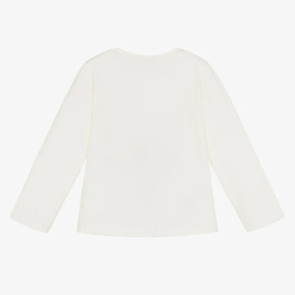 Cute ivory cotton long-sleeved top for girls by Spanish brand Mayoral, made in comfortable jersey. It has a girls-in-the-rain print on the front in blue and beige, shimmering with sequins and shiny gold.
