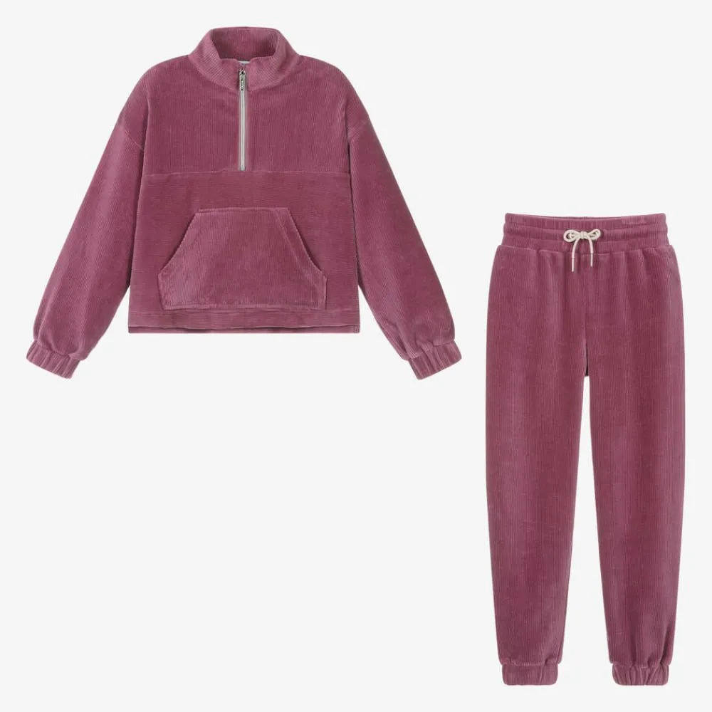 Mauve purple tracksuit for older girls by Mayoral, made in a soft cotton blend corduroy with a distinctive ribbed texture. The long-sleeved top has a half-zip fastening and a roomy pouch pocket on the front. The cuffs are gently elasticated for added comfort. The matching bottoms have a drawstring fastening on the waist to easily adjust the fit.