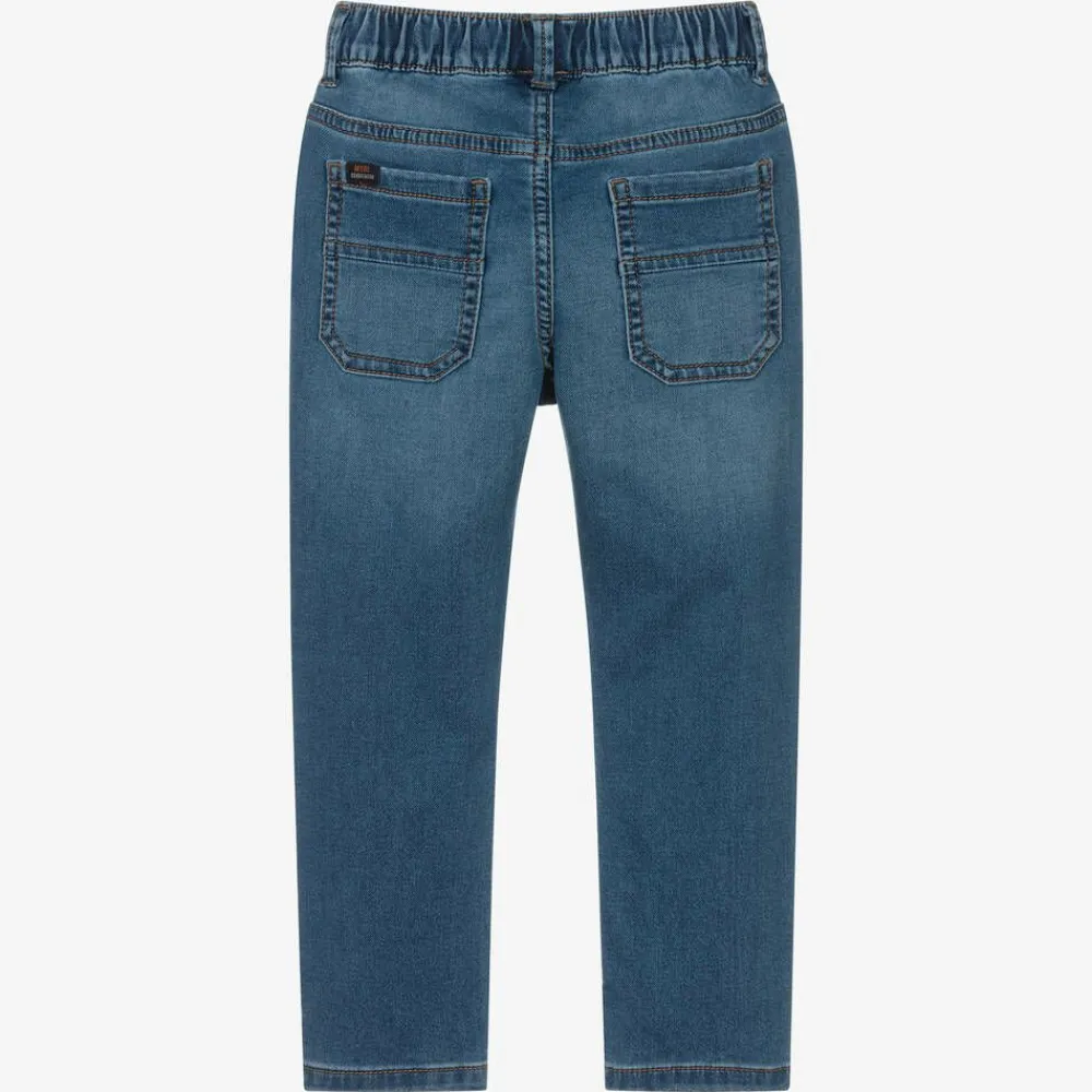 Washed blue jeans for boys by Spanish brand Mayoral, made in a soft and stretchy cotton blend. With the appearance of authentic denim, these comfortable bottoms have five-pocket styling, yellow topstitching and a stretchy, drawstring waist.