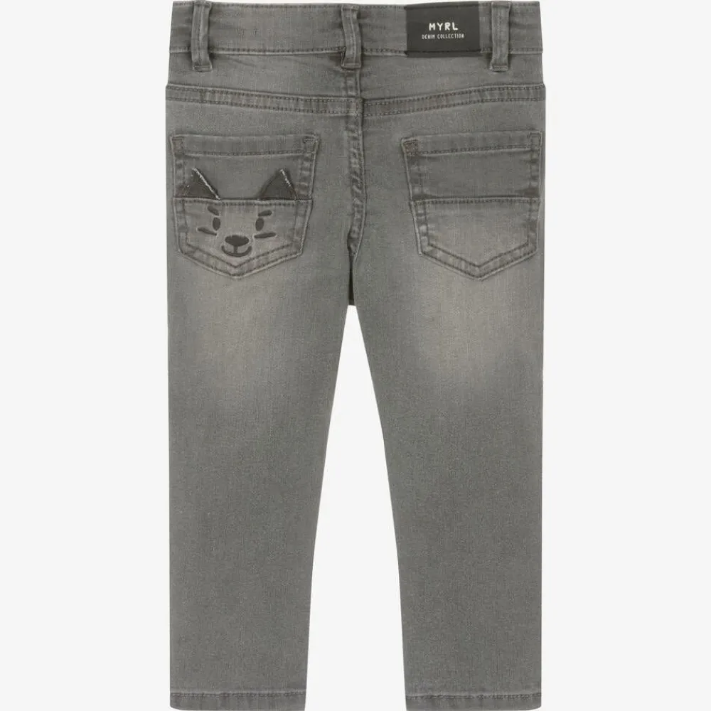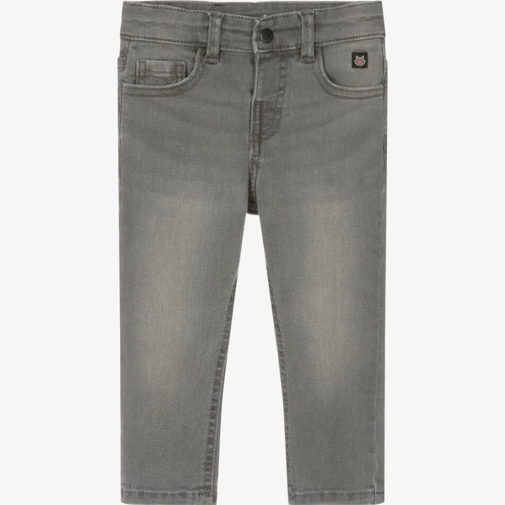 Washed grey jeans for little boys by Spanish brand Mayoral, made from soft stretch denim for comfort and movement. With five-pocket styling, these slim fitting jeans have an adjustable waistband and a single popper fastening on the front. A cute animal face is embroidered on the back pocket with fun 3D ears.