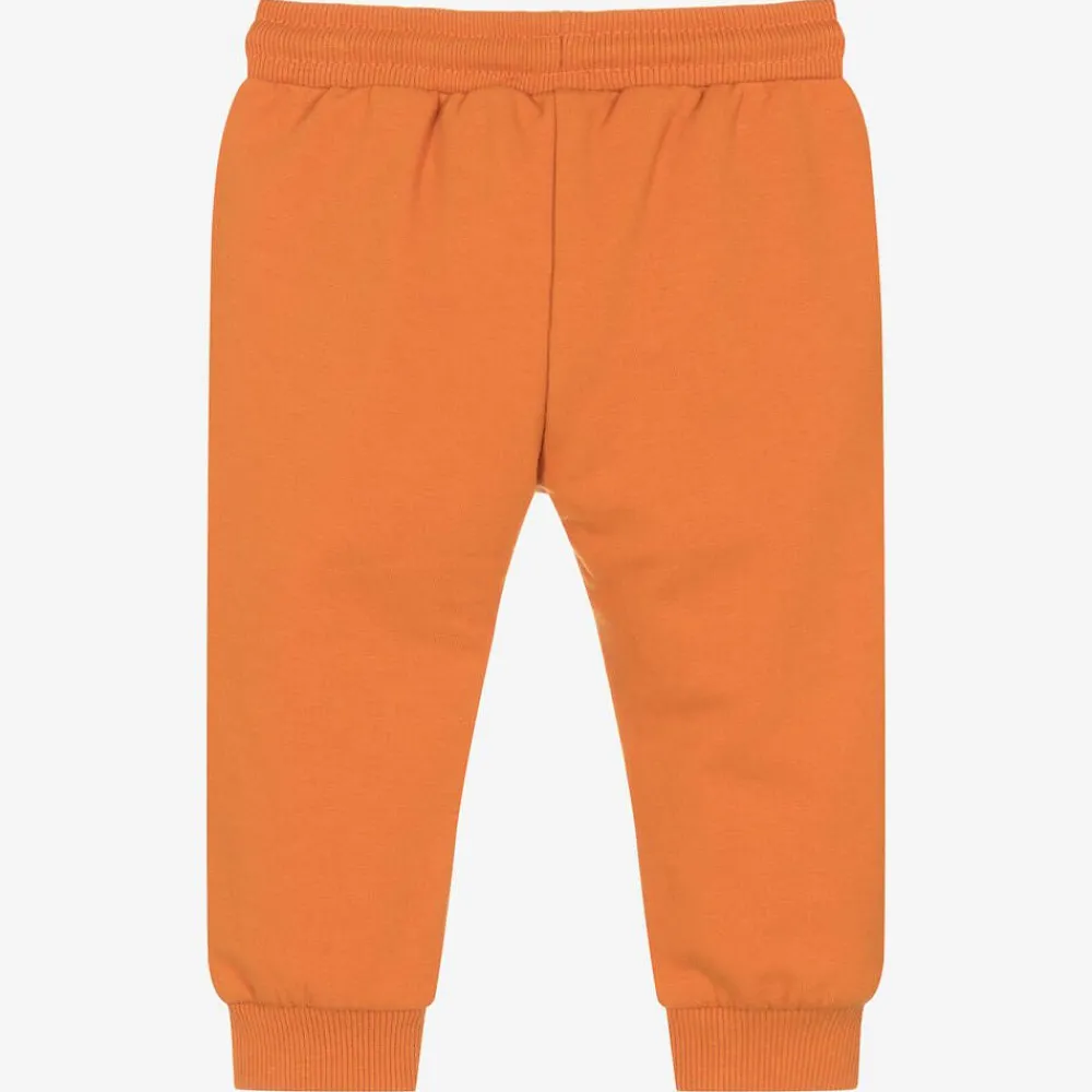 Orange joggers for little boys by Mayoral, made from a soft and stretchy cotton jersey blend. Great for casual wear, they have an adjustable drawstring waist, extra durable knees and side seam pockets. A tonal logo is featured on the front.