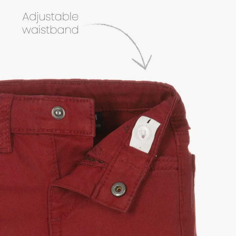 Dark red trousers for little boys by Mayoral, made in soft cotton twill with added stretch. Designed to look like jeans, these casual, slim fit trousers have five-pocket styling and a logo patch stitched on the back of the waistband. They fasten with a branded popper and they have an adjustable waist for extra growing room.