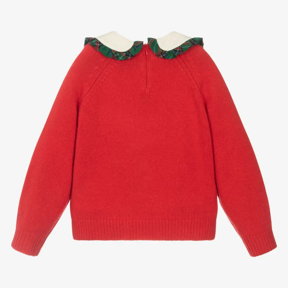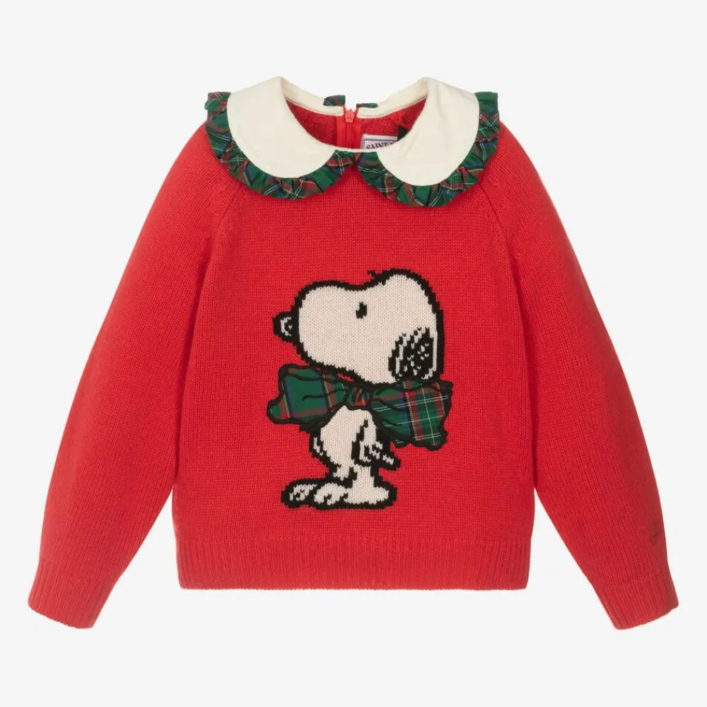 Ideal for Christmas, this red sweater for girls is by MC2 St Barth, with Peanuts character Snoopy on the front. Knitted in a super soft, cosy wool and cashmere blend, it has an ivory, brushed twill collar and festive green tartan trims.