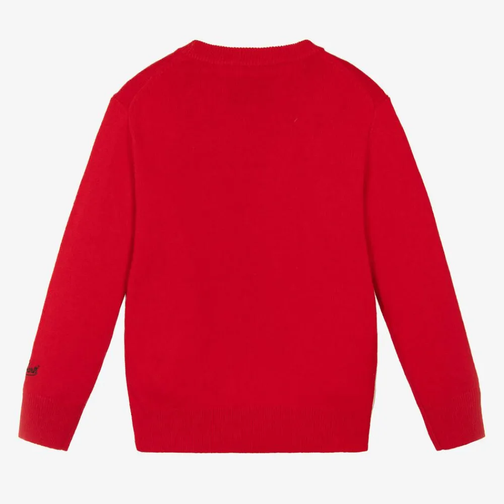 Red festive Mini-me sweater for boys and girls by MC2 St Barth, made in a soft wool and cashmere blend. Peanuts character Snoopy and his friends are on the front, with a Christmas tree. The jumper has cosy ribbed trims and an embroidered logo on one cuff for instant brand appeal.