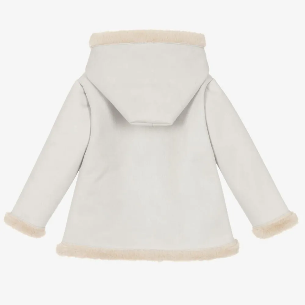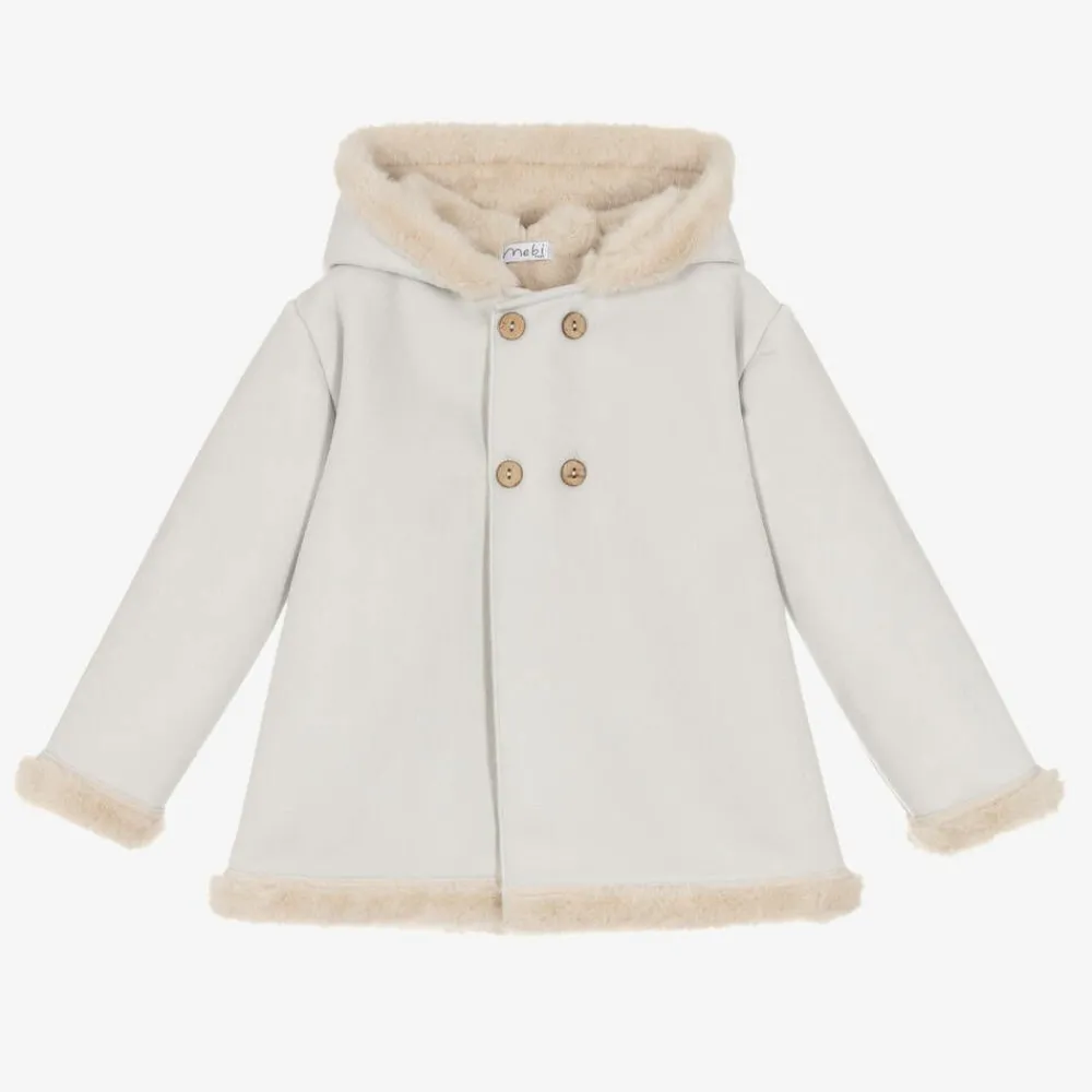 Lovely light grey coat for boys and girls by Spanish brand, Mebi. Made in smooth faux suede, this hooded coat fastens with wooden-style buttons on the front. It is lined in luxuriously soft plush faux fur for a super warm and cosy fit.