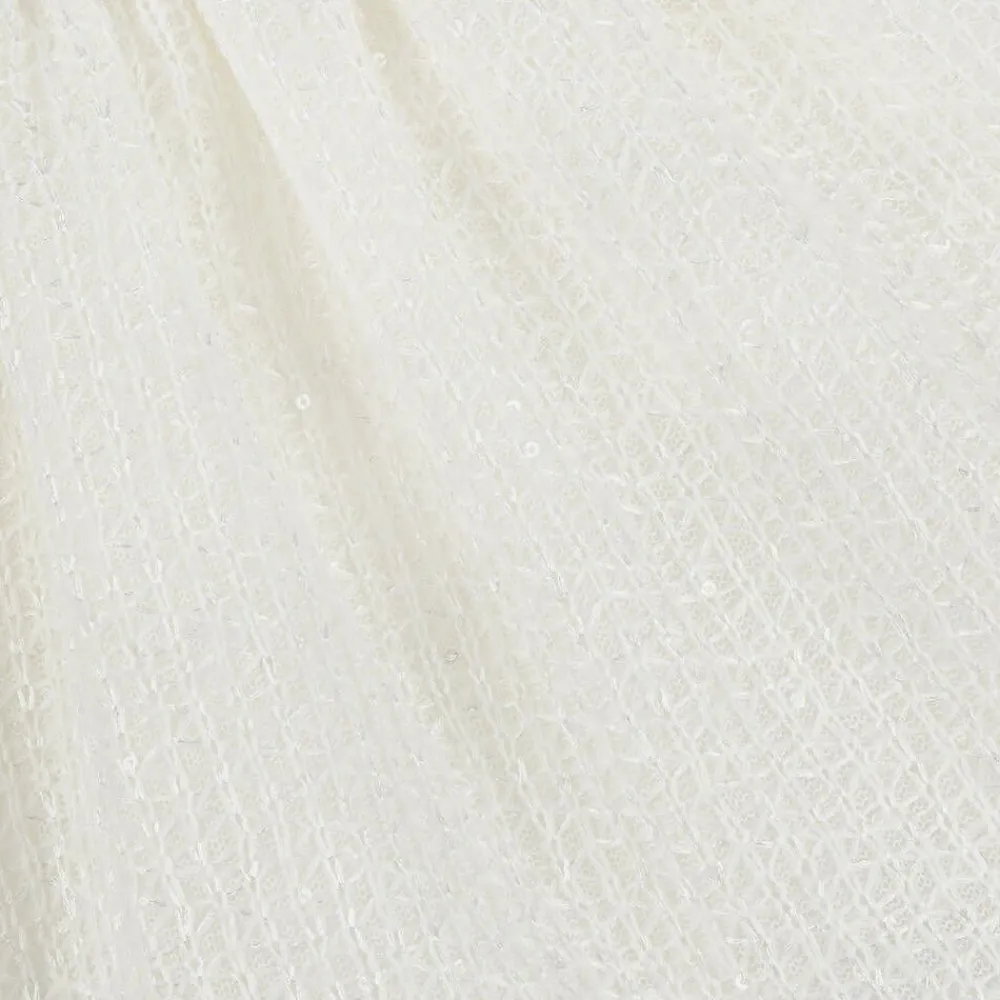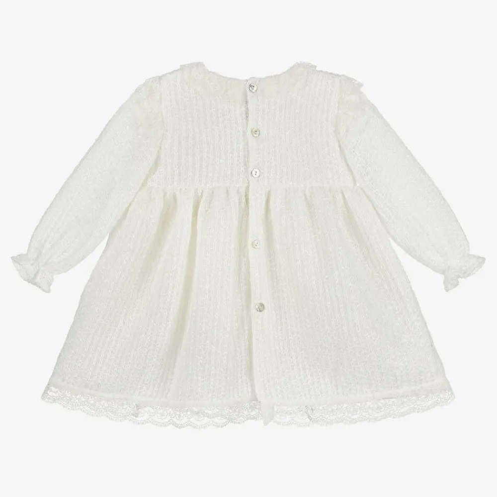 A gorgeous ivory dress for younger girls by Mebi, made in a delicate viscose blend knit. Intricately patterned and detailed with shimmering sequins, this delightful dress has beautiful, scalloped lace trims on the collar, hem and shoulders. Lovely for those special occasions, it has long sleeves with gently elasticated cuffs and charming mother-of-pearl button fastenings on the back. For a comfortable feel against delicate skin, the dress is lined in lightweight voile. Mebi is a very small fitting brand, please choose a size up to allow room to grow.