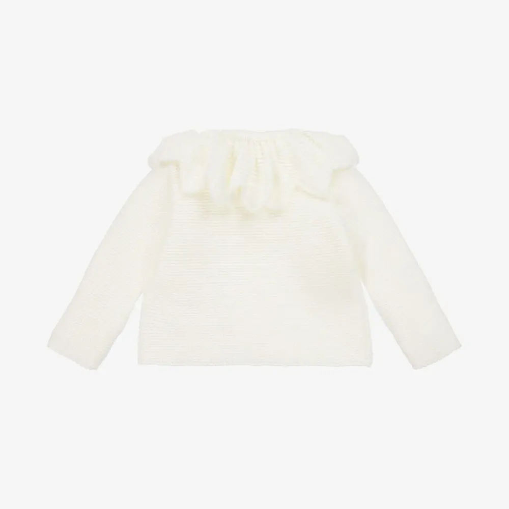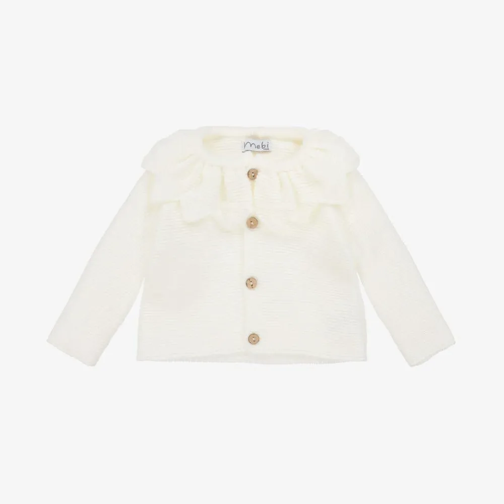 Super sweet, this ivory long-sleeved cardigan for little girls is by Mebi. Made from a soft knit, it has a charming gathered collar with zig-zag edging for a fun and adorable look. It fastens with beige buttons on the front for a neat finish. Mebi is a very small fitting brand, please choose a size up to allow room to grow.