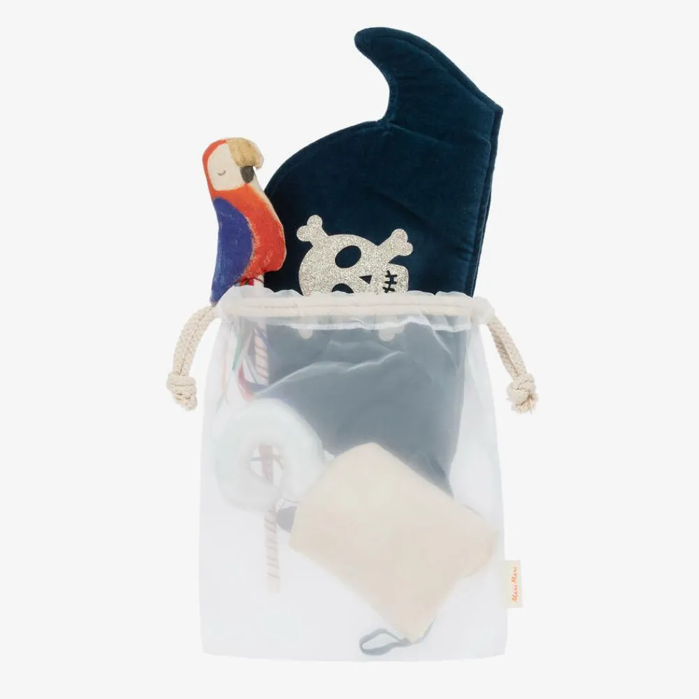 This pirate costume set for boys and girls is by Meri Meri. Ideal for parties or imaginative play, it features a fabulous blue velvet pirate hat with a glittery silver skull and crossbones motif on the front. The shiny gold eye patch is gently padded and has a velcro fastening elasticated velvet strap for a comfortable fit. It comes with a softly padded silver hook that can be held easily inside the sleeve. A wooden wand completes the set, it is topped with a softly padded, colourful parrot and ribbons for a fun finish.