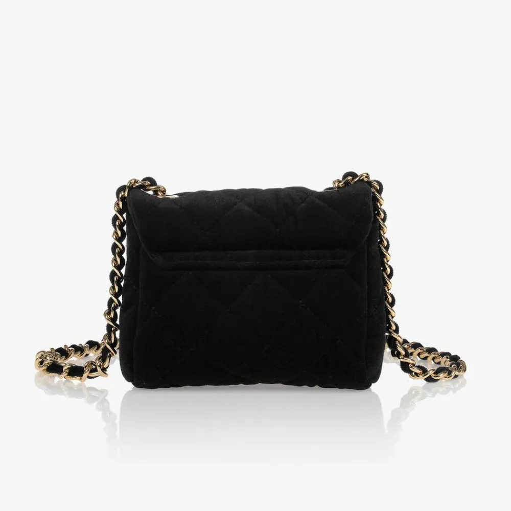 Girls small, black bag from Milledeux, beautifully handmade in soft quilted velvet. Lined in lightweight cotton, it is just right for carrying small essentials. The flap has a gold twist lock closure and the sumptuous velvet and gold chain strap can be doubled for a shorter length.