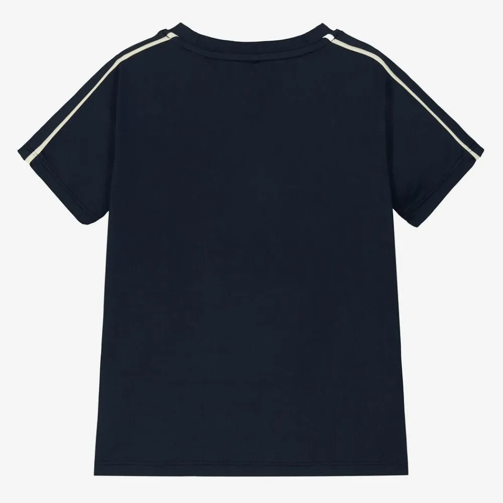 A sporty navy blue T-shirt for boys and girls by Mini Rodini, made in silky smooth, stretchy jersey with ivory trims on each shoulder. Making movement easy, this short-sleeved top is made in breathable, quick dry fabric to keep them cool and dry on active days. A logo design is printed on the chest for brand recognition. This product contains recycled materials.