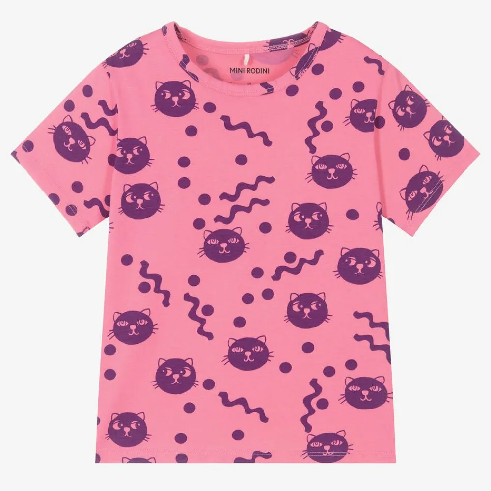 Fun and vibrant pink T-shirt for girls by Mini Rodini, patterned with cute cats and squiggly motifs in purple. This comfortable short sleeve tee is made in super soft organic cotton jersey.
