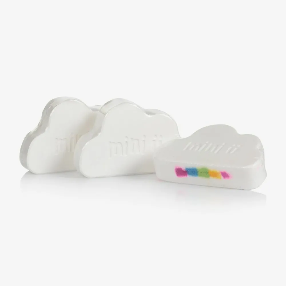 A pack of three cloud-shaped bath bombs for little boys and girls by Mini U, with added shea butter. These bombs change the colour of the water by realising a rainbow for a fun and interactive bathtime. To use, simply drop a bomb into warm water and watch it fizz. They have a fresh cherry blossom scent.