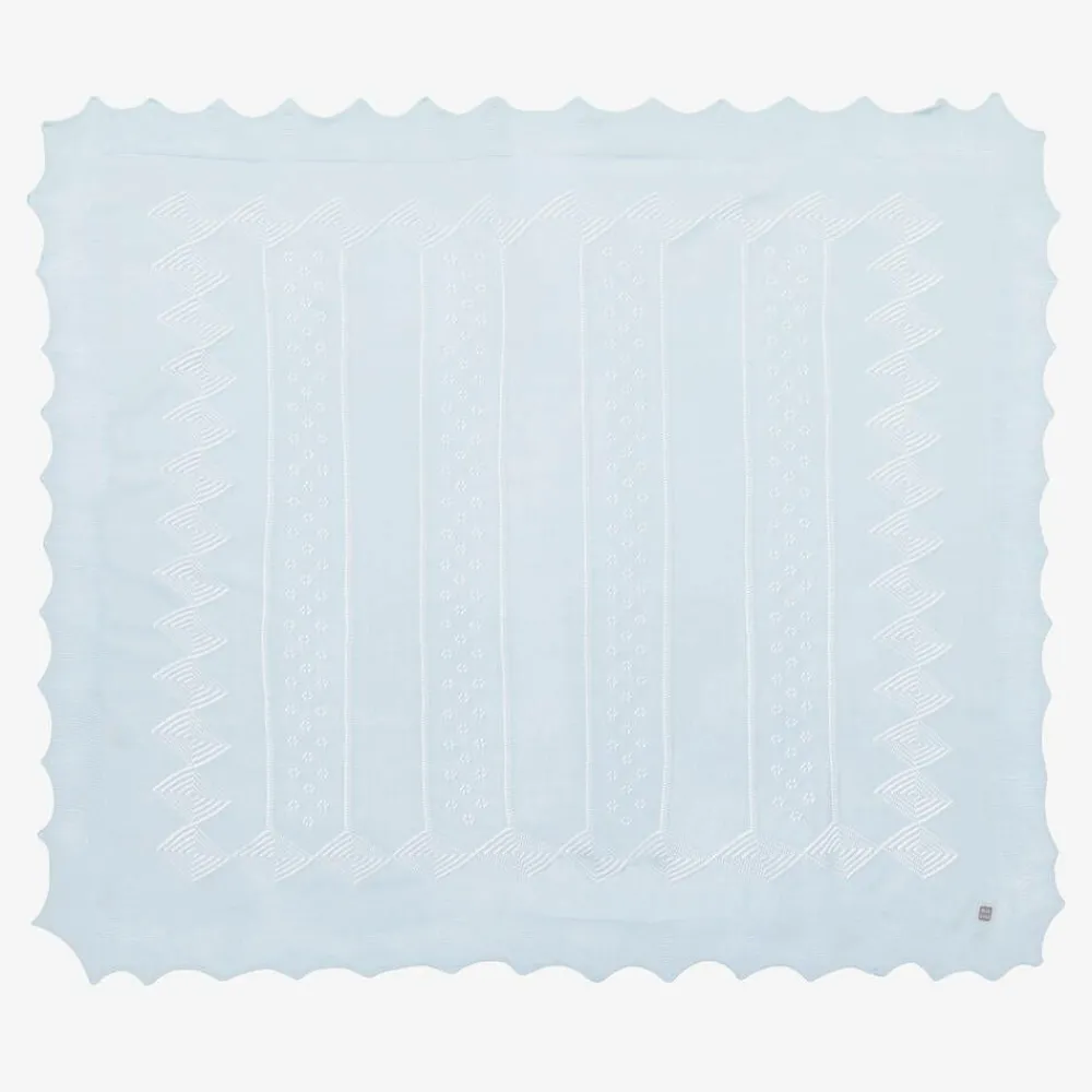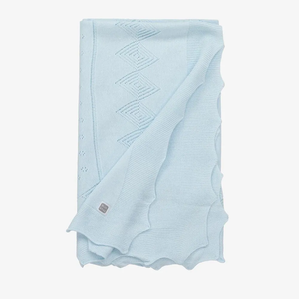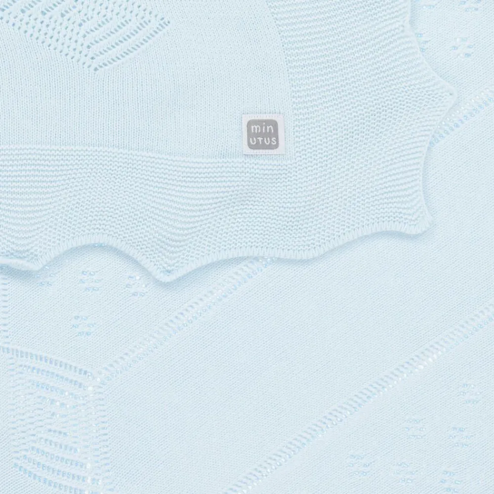 A lightweight pale blue shawl for baby boys and girls by Spanish designer Minutus. Finely knitted with a delicate pattern, it has gently scalloped edges. Lovely for wrapping and presenting baby, it can also be used in the nursery or stroller.