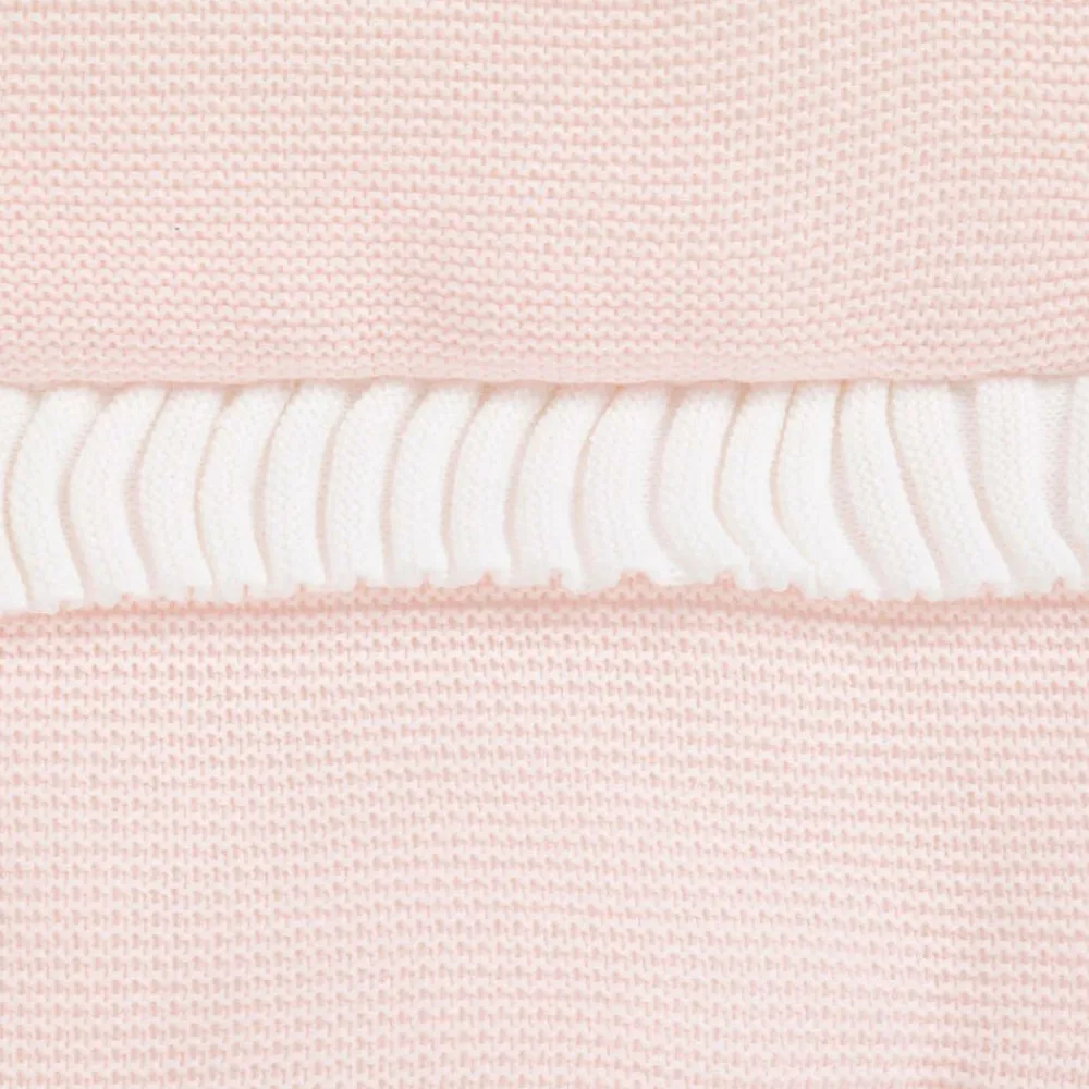 A lovely pale pink knitted baby nest for girls by Minutus. Beautifully soft and warmly padded, it has a white knitted lining and knitted ruffle trims. There is a concealed front zip fastening, with a small branded tab at the bottom.