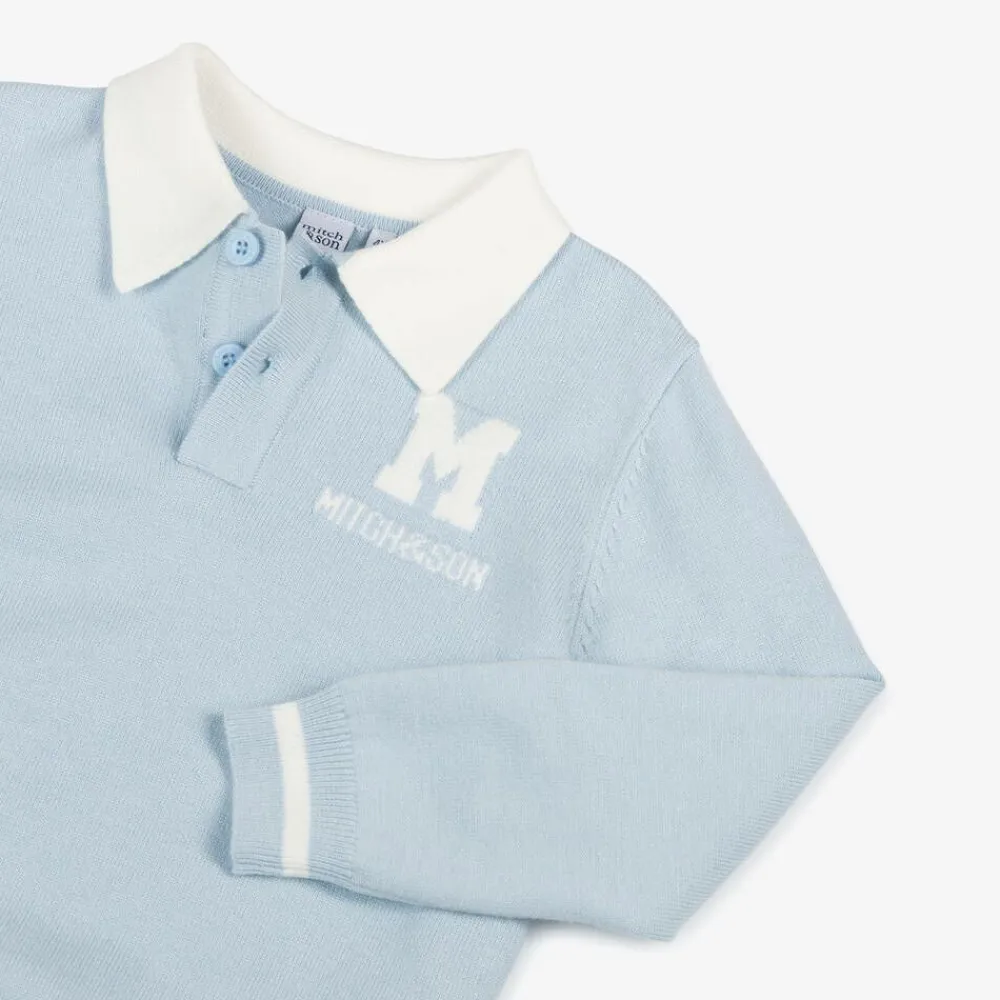 Pale blue sweater for boys by Mitch & Son, made in a soft knit. Styled like a polo shirt, it has a white collar and button fastening on the front for a fun stylish twist on a classic item.