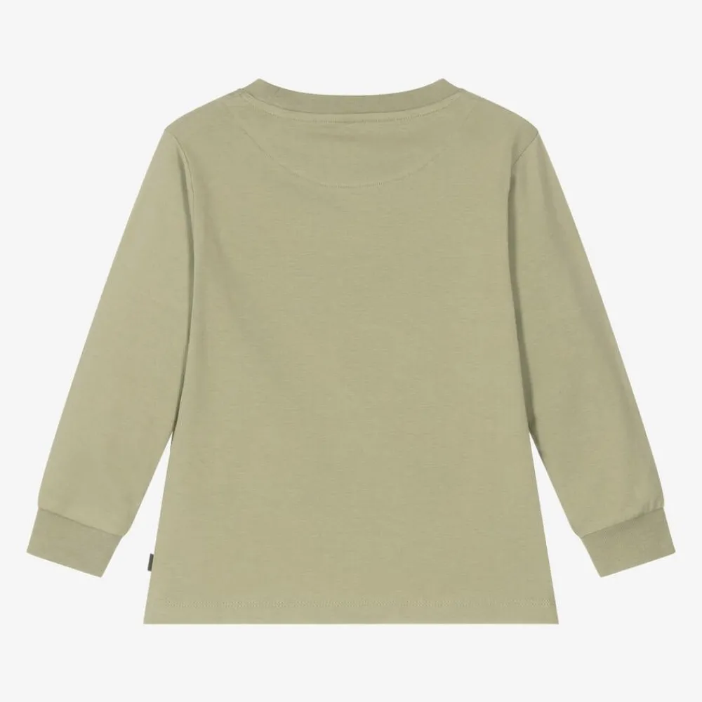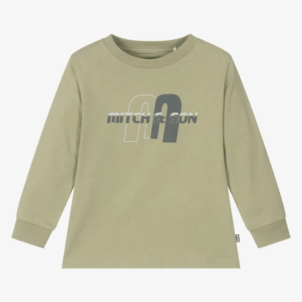 Casual pale khaki green top for boys by Mitch & Son, made in super soft cotton jersey. This long-sleeved, crew neck tee has a grey logo print on the front and a branded rubberised patch on the side seam.