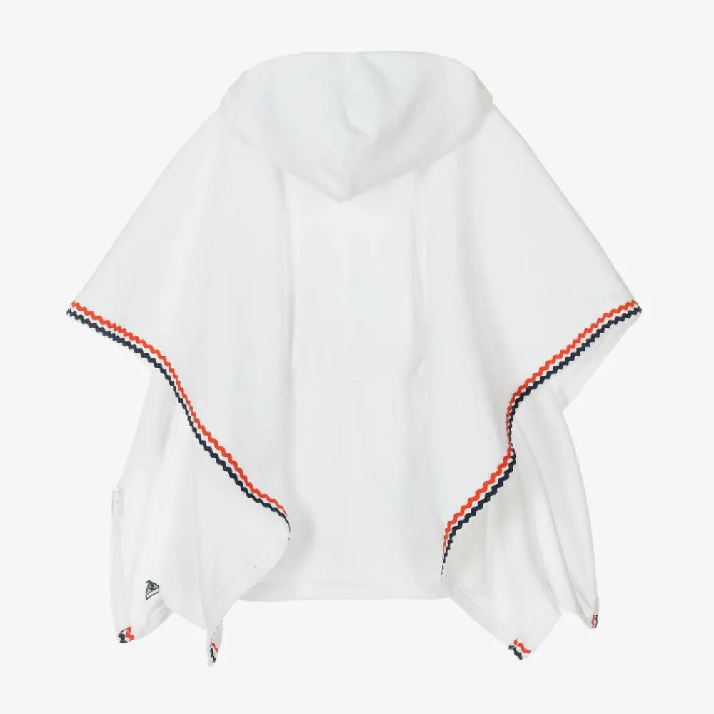 Exclusive to Childrensalon, a white hooded poncho towel for girls by Mitty James, with navy blue and white ric rac trims. Made in soft, absorbent towelling, it is ideal for wearing over a swimsuit on the beach or by the pool. It has a hood lined in soft jersey and an elasticated waist for a neat fit, with a faux drawstring and navy blue pom-poms. The brand's logo is by the hemline, embroidered in navy blue.