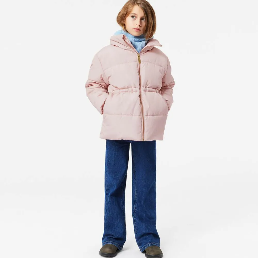 Silky pale pink puffer jacket for girls by Danish brand Molo, with a colourful butterfly print on the back. With cosy, mid-weight, technical down padding, it has a velcro-secured hood concealed in the stand-up collar, as well as elasticated cuffs to keep the chilly weather out. There is an internal, drawstring waistband for a great fit and useful, concealed side seam pockets. The front zip fastening has a protective chin guard, and a golden, branded pull tab. The jacket is lined in lightweight, blue satin for comfort.