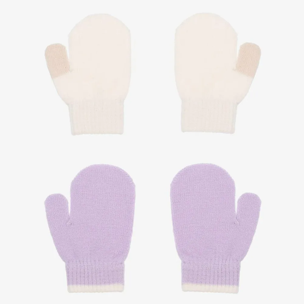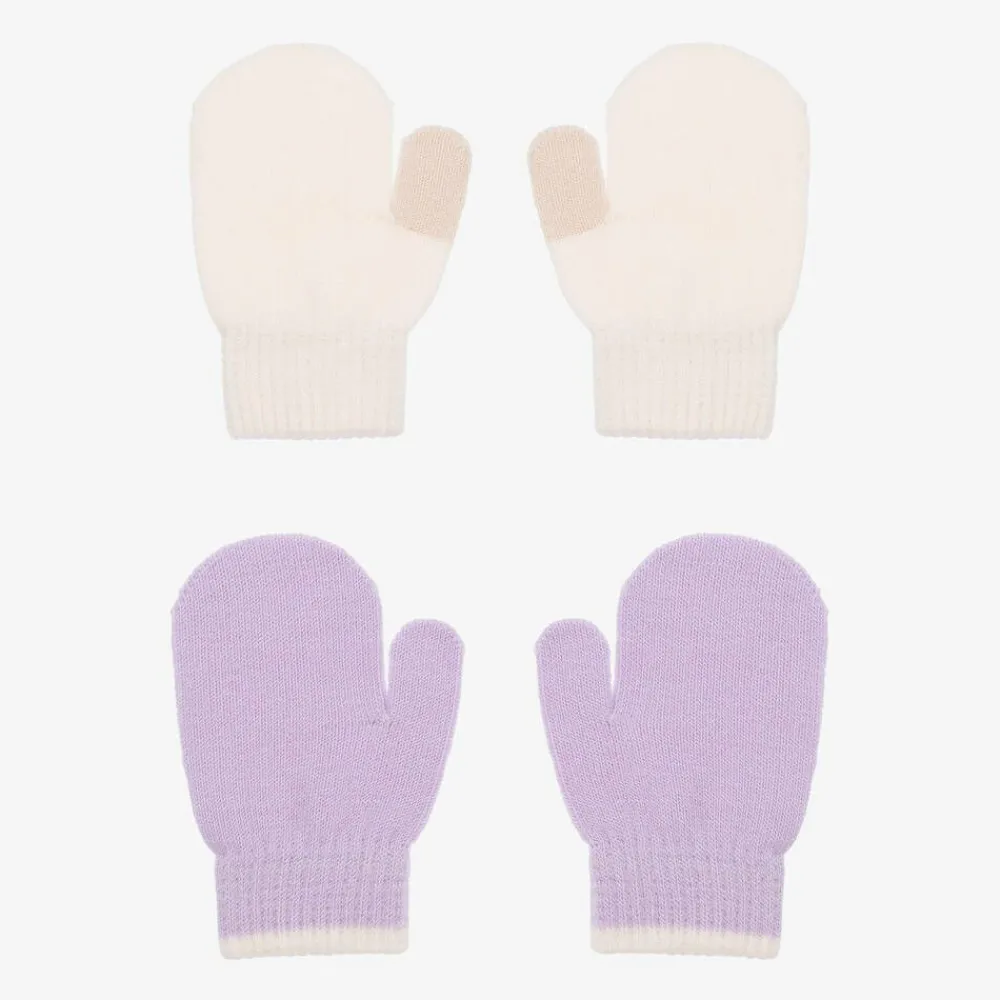 Two pairs of mittens for baby girls by Molo, in pretty shades of lilac purple and ivory. In a subtle colourblock design, both pairs are made from a soft and cosy knit, ideal for cooler temperatures.