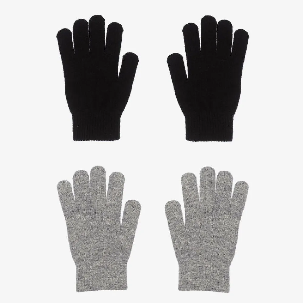 Black and grey gloves for boys and girls by Molo, in a useful pack of two. Warm and comfortable, they are knitted in a soft wool blend that is ideal for cooler temperatures.