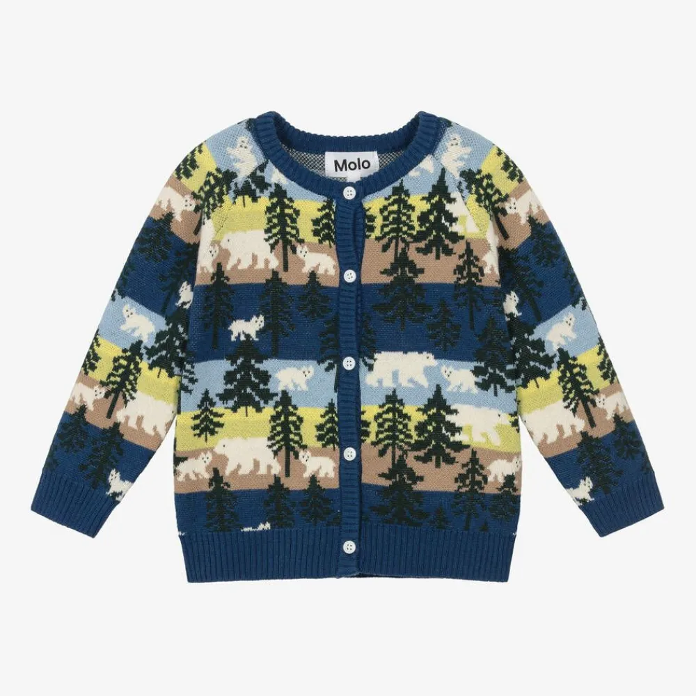 Patterned with trees and polar bears, this cute Molo cardigan for little boys and girls is striped in blue, beige and green. It is designed in a classic crew neck style with gently ribbed trims and is knitted in soft cotton blended with wool for cosy wear. There is a discreet branded tab on the side seam to complete the look.