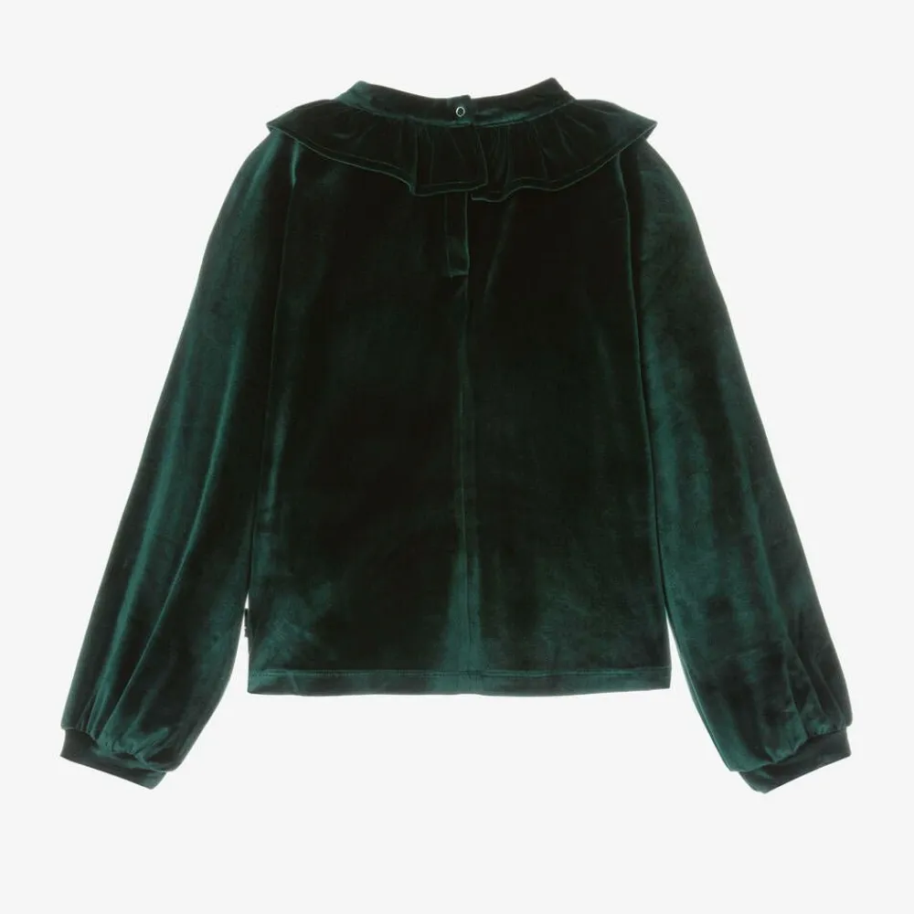 Lovely dark green velour blouse for girls by Danish brand Molo, beautifully soft with a smooth and velvety finish. Elegant and traditionally styled for both smart and casual looks, it has a ruffle trim around the neck and gently puffed long sleeves. To help with over-the-head dressing, it fastens with a popper on the back.