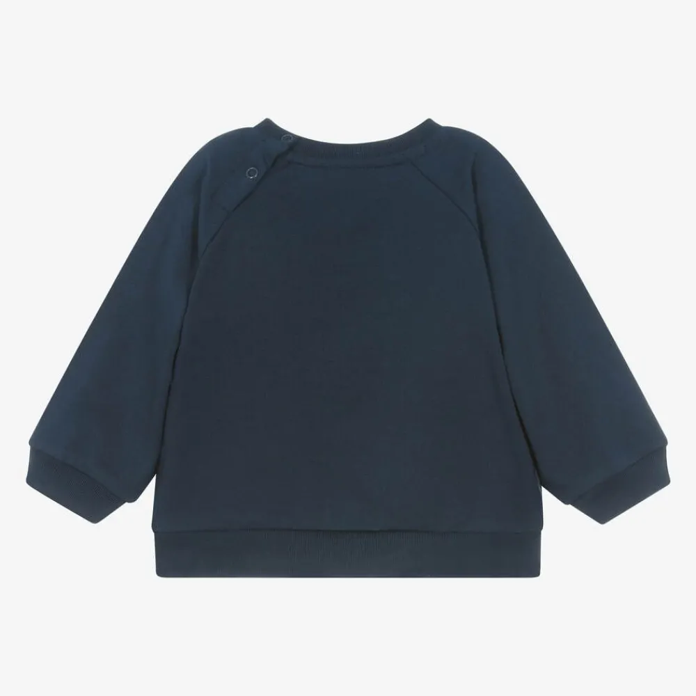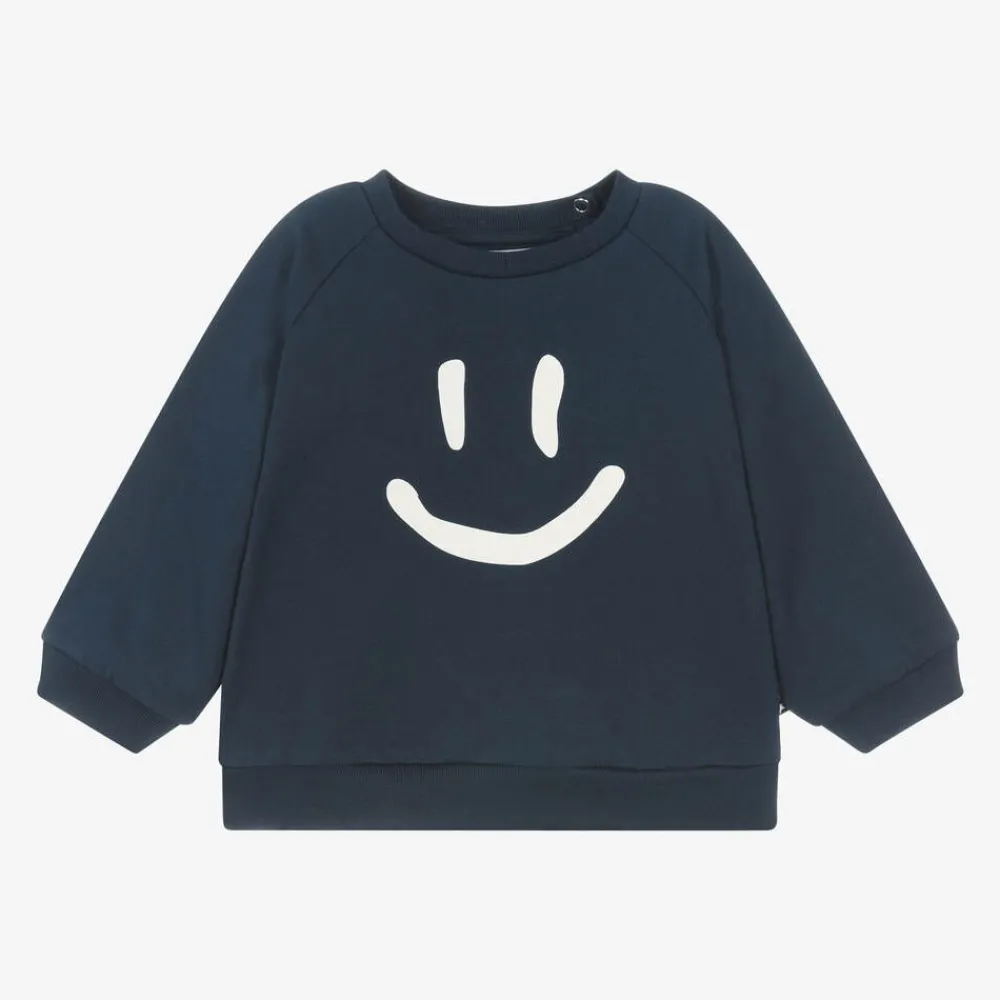 Cute navy blue sweatshirt for little boys and girls by Danish brand Molo, with a smiling face printed on the front. Casual and comfortable, it is made in soft organic cotton jersey with a cosy fleecy inside and popper fastenings on the back of the raglan sleeve. A small logo tab on the side seam adds a designer finishing touch.