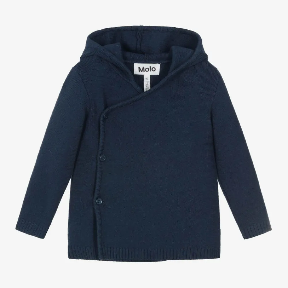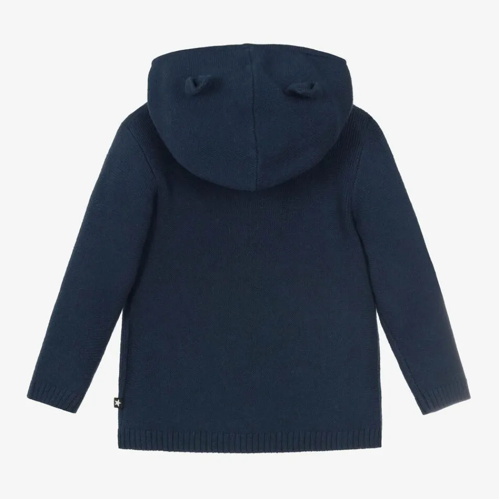 Navy blue hooded cardigan for baby boys and girls by Molo, knitted in a soft cotton and wool blend. This double-breasted style has gently ribbed trims, button fastenings and little 3D ears on the hood for a cute touch. The Danish brand's star tab can be seen on the side seam.