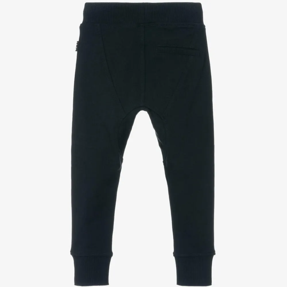 Casual navy blue joggers for boys by Molo, made in soft mid-weight organic cotton jersey. These joggers have a ribbed drawstring waist, zip-up front pockets and a faux pocket on the back for laid-back styling.