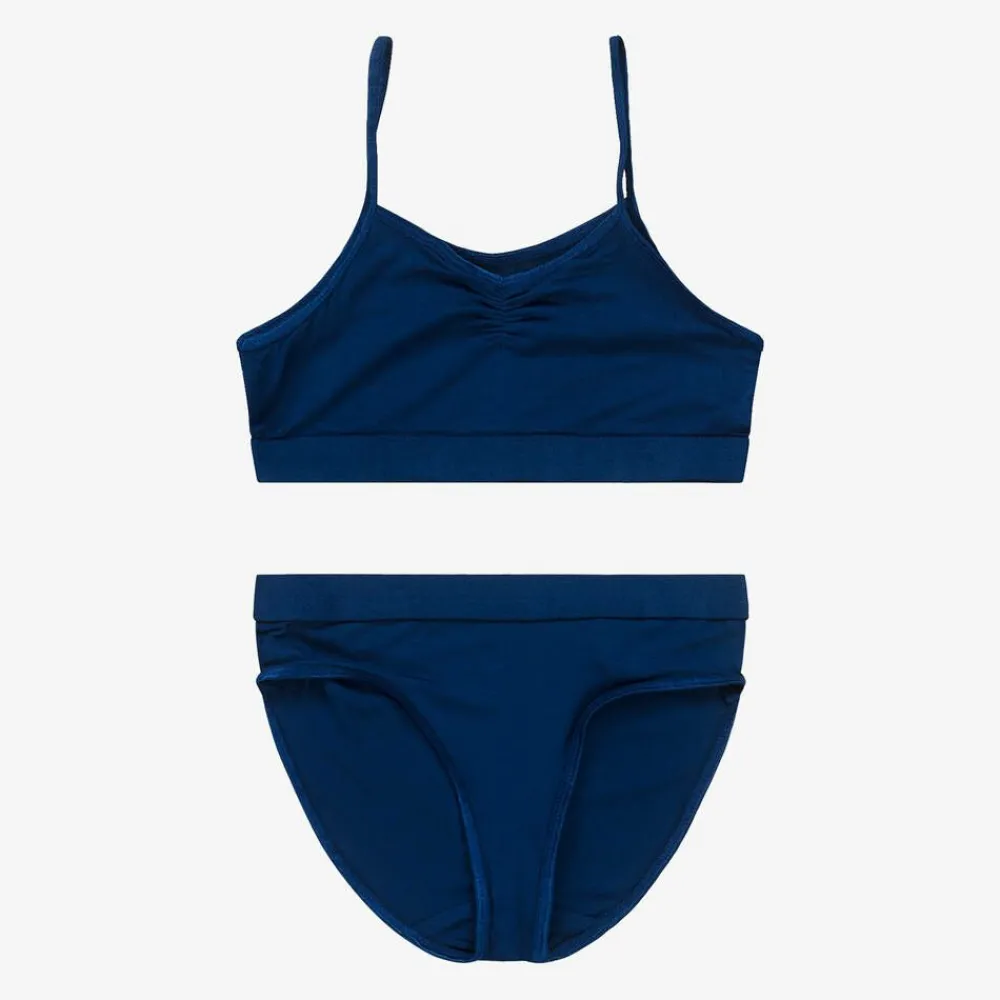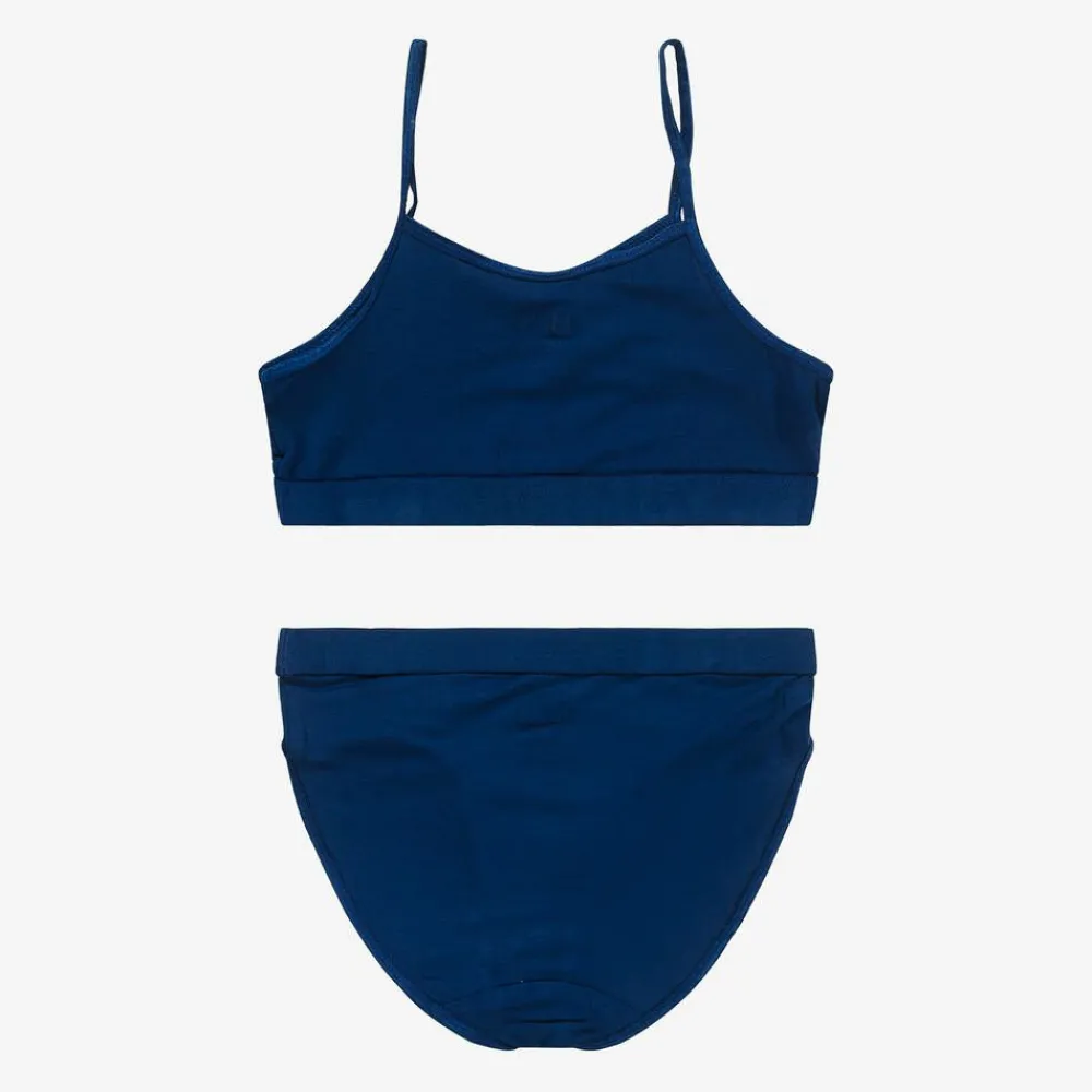 In a lovely shade of deep blue, this bra top and knickers set for girls is by Molo. The bra top has ruched detailing on the chest and narrow stretchy straps. Both pieces are made from super soft viscose jersey and have elasticated tape trims for added comfort.